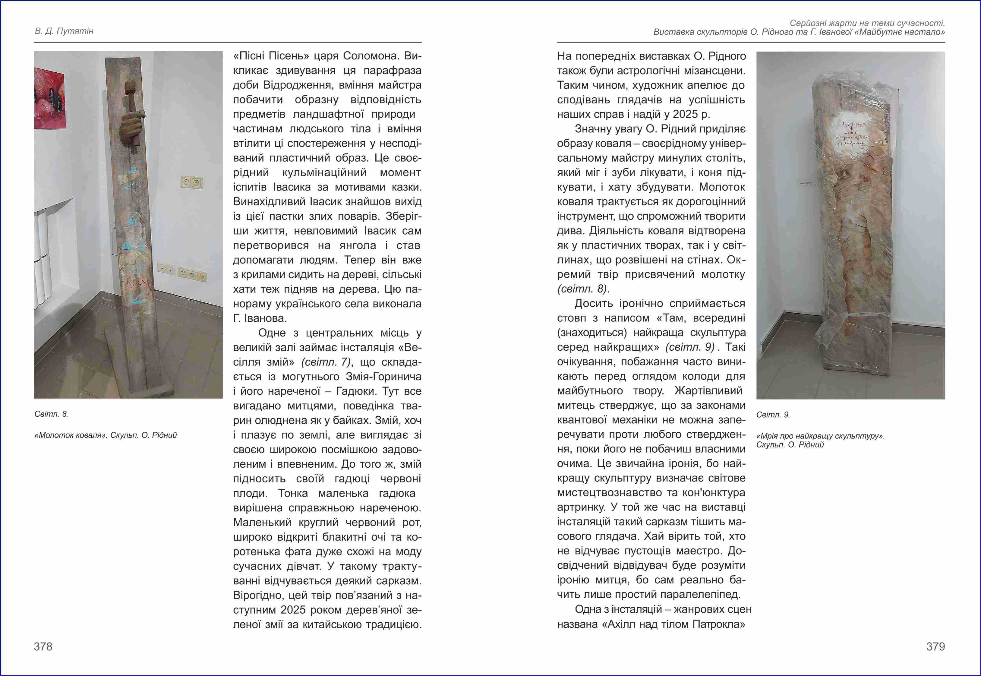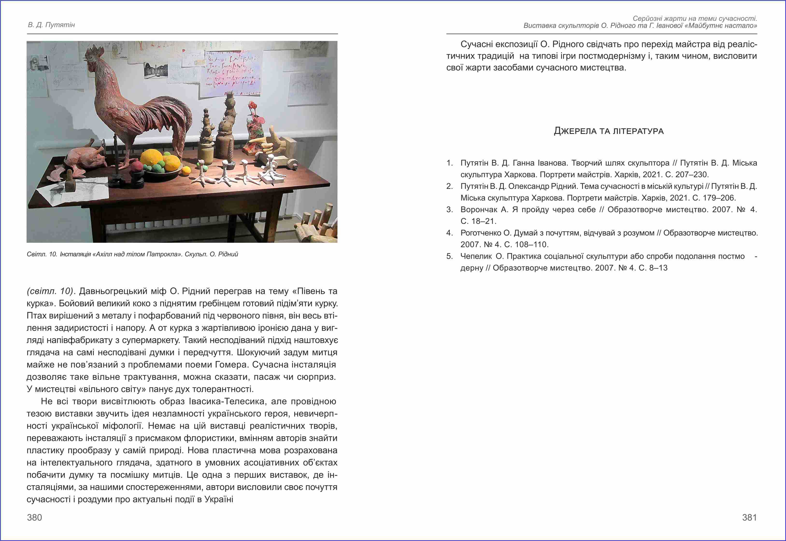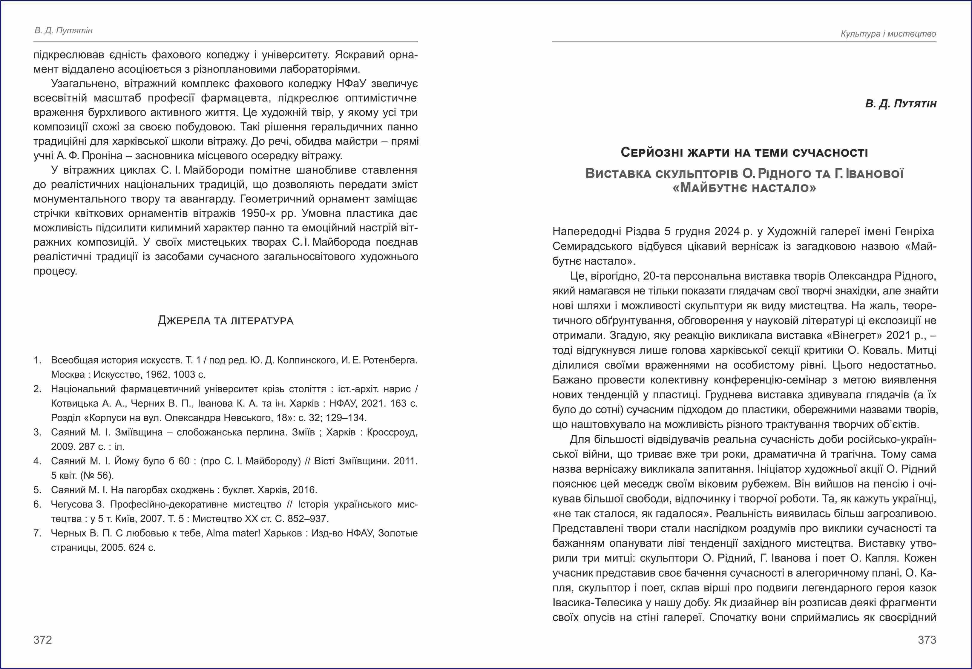 | Бібліографія: | Путятін В. Д. Серйозні жарти на теми сучасності. Виставка скульпторів О. Рідного та Г. Іванової «Майбутнє настало» . Культурна спадщина Слобожанщини: зб. наук. ст. Число 57, Харків : Курсор, 2025. C. 373–381 , іл. |