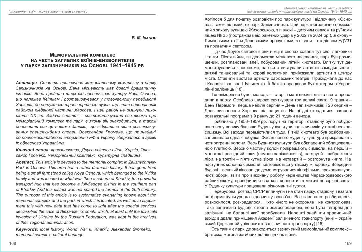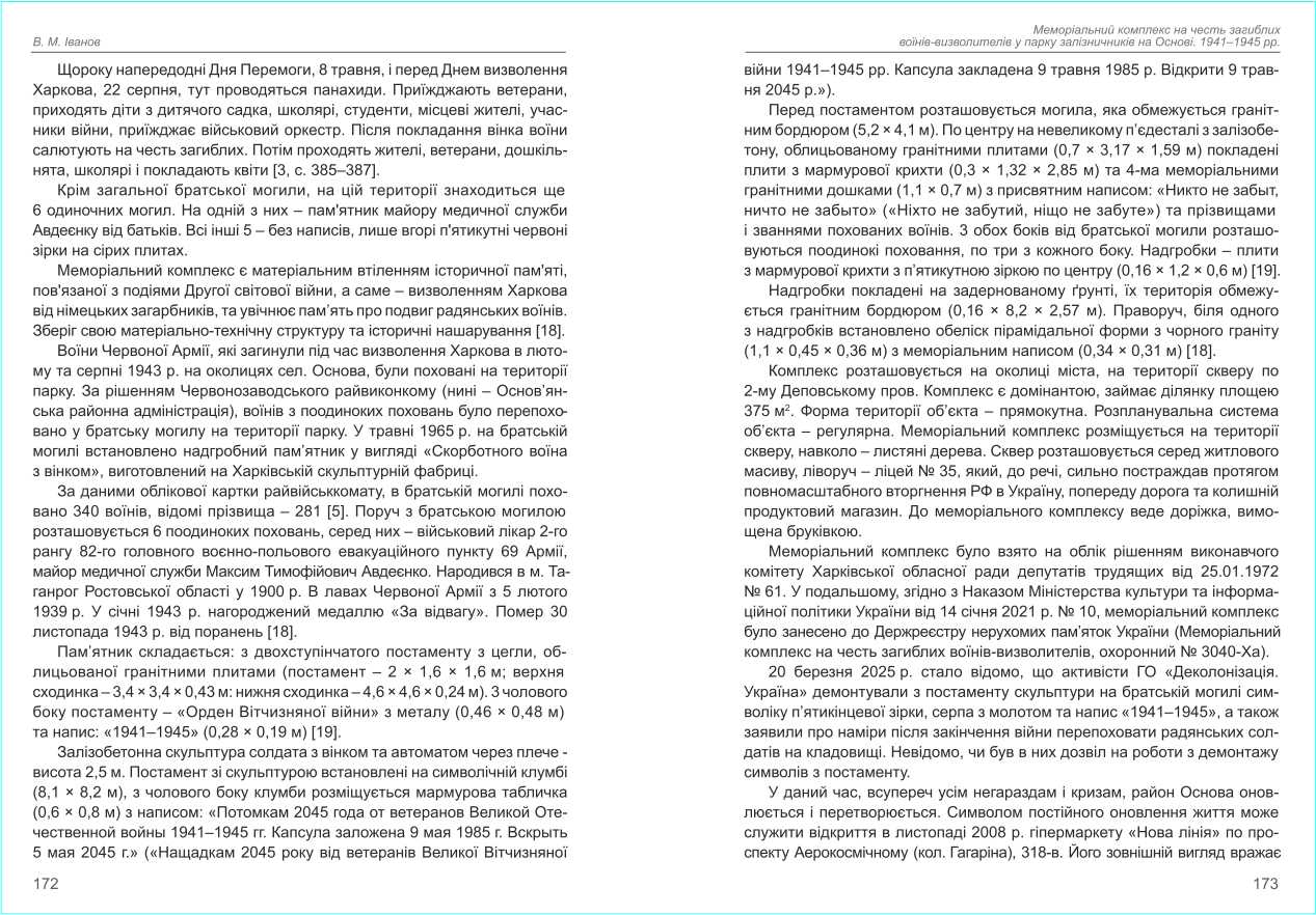 | Бібліографія: | Іванов В. М. Меморіальний комплекс на честь загиблих воїнів-визволителів у парку залізничників на Основі. 1941–1945 рр. Пам'яткознавчі студії дослідників ХХІ ст.: зб. наук. ст. Випуск X, Харків : Курсор, 2026. C. 168–175 , іл. |