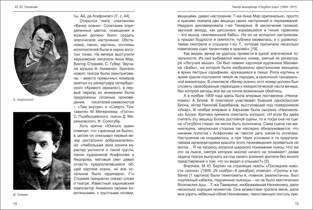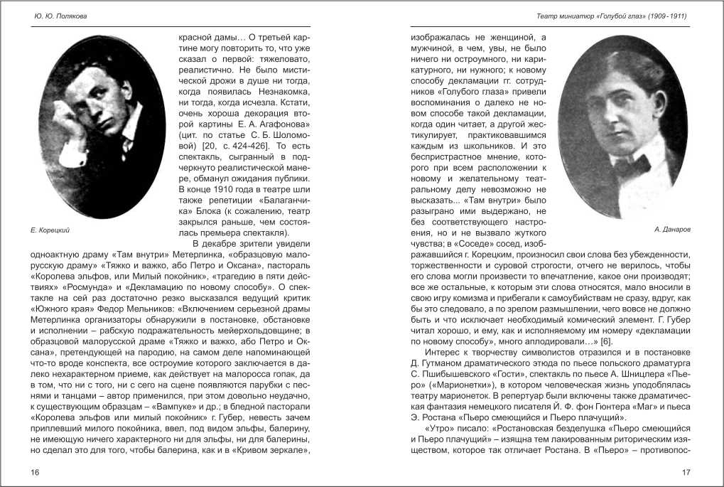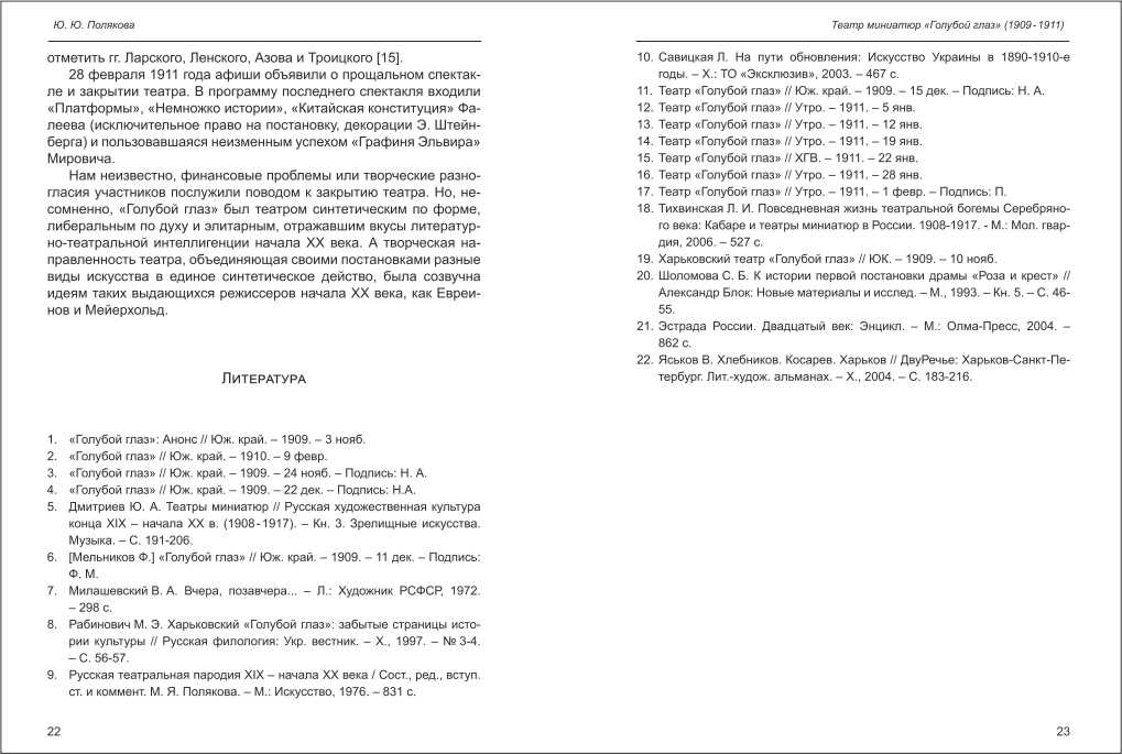 | Бібліографія: | Полякова Ю. Ю. Театр миниатюр "Голубой глаз" (1909-1911). Культурна спадщина Слобожанщини: зб. наук. ст. Збірка 21, Харків : Курсор, 2008. C. 12–23 , іл. |
