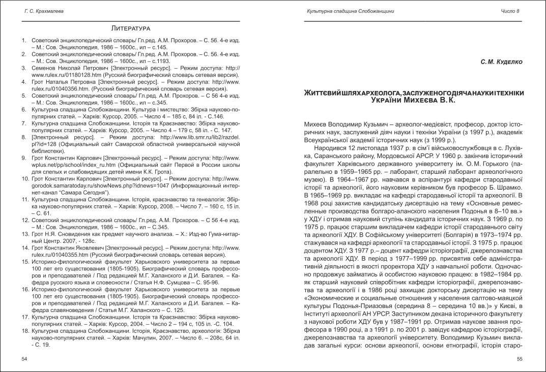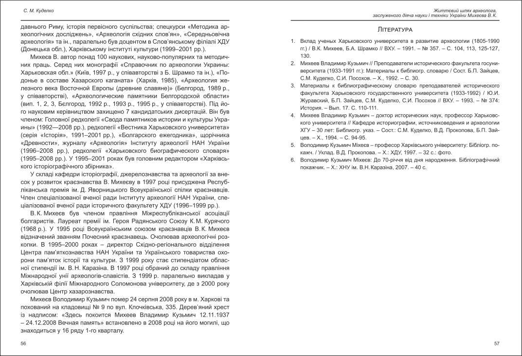 | Бібліографія: | Куделко С. М. Життєвий шлях археолога, заслуженого діяча науки і техніки України Михеєва В.К. Культурна спадщина Слобожанщини: зб. наук. ст. Збірка 22, Харків : Курсор, 2010. C. 55–57 |