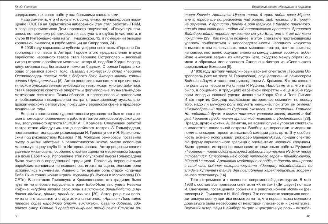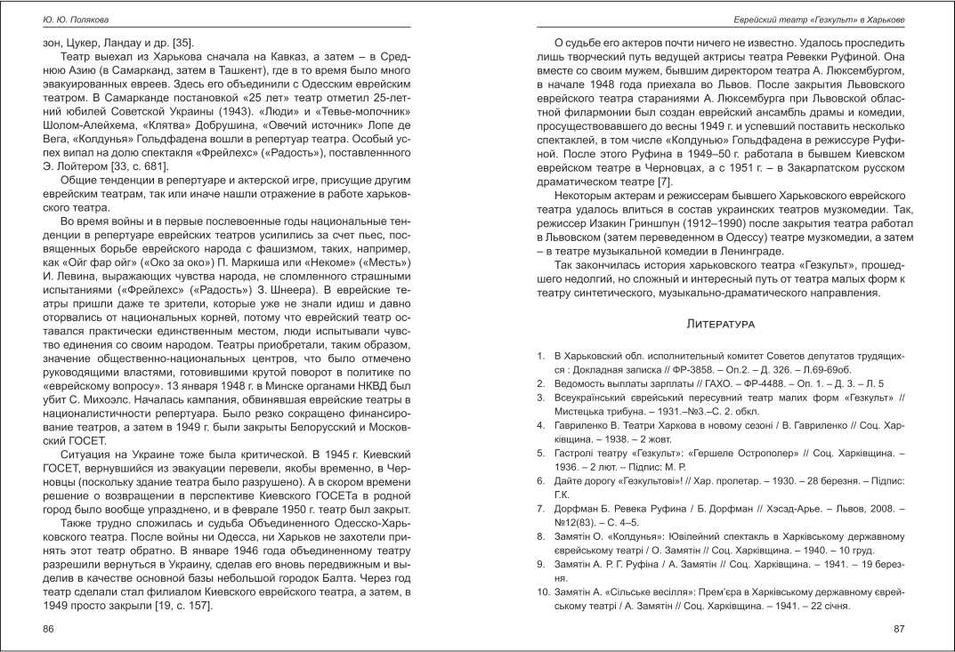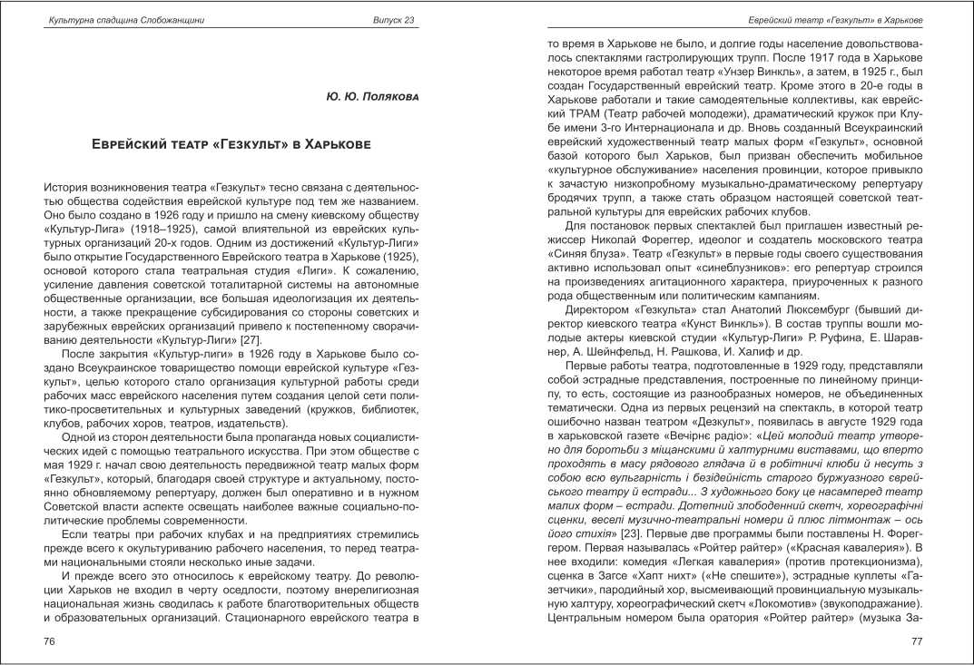 | Бібліографія: | Полякова Ю. Ю. Еврейский театр "Гезкульт" в Харькове. Культурна спадщина Слобожанщини: зб. наук. ст. Число 23, Харків : Курсор, 2010. C. 76–89 |
