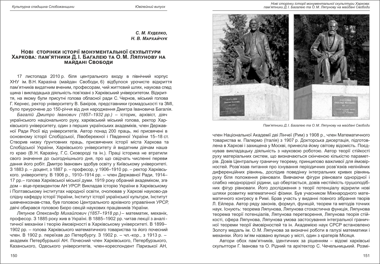 | Назва статті: | Нові сторінки історії монументальної скульптури Харкова: пам'ятники Д.І. Багалею та О.М. Ляпунову на майдані Свободи |
