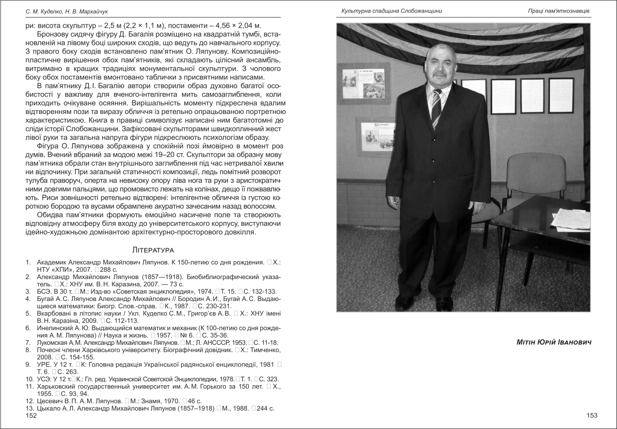 | Бібліографія: | Куделко С. М., Мархайчук Н. В. Нові сторінки історії монументальної скульптури Харкова: пам'ятники Д.І. Багалею та О.М. Ляпунову на майдані Свободи. Праці пам'яткознавців: зб. наук. ст. Випуск II, Харків : Курсор, 2012. C. 150–152 , іл. |