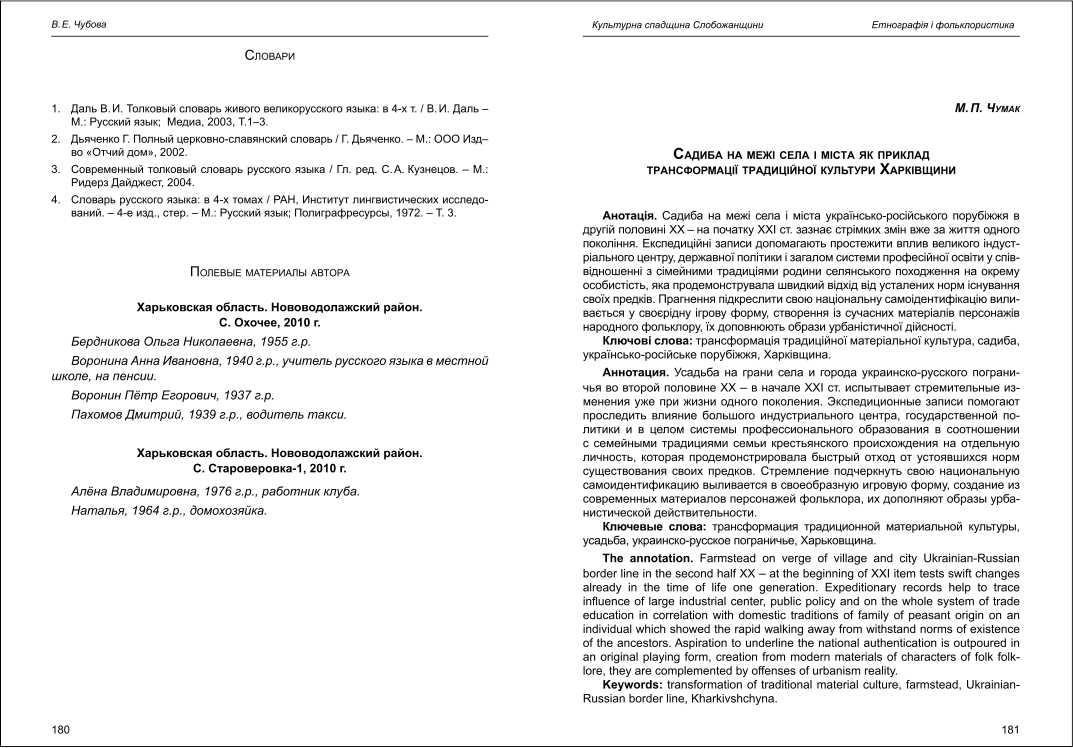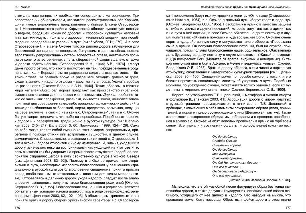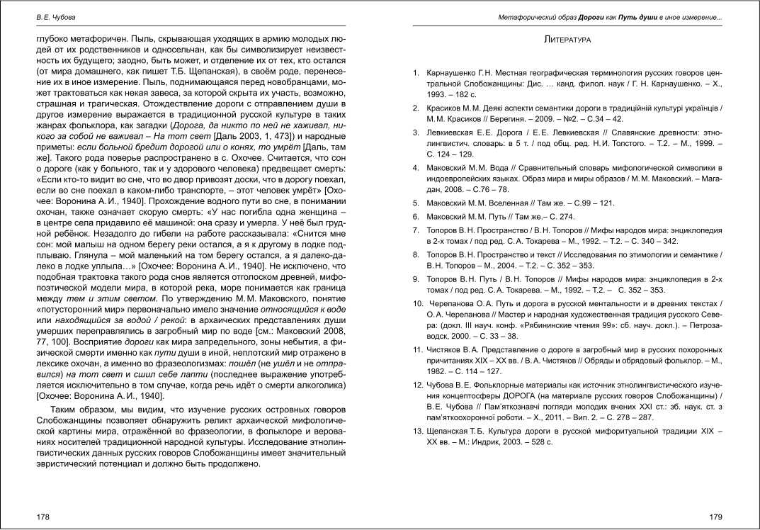 | Бібліографія: | Чубова В. Є. Метафорический образ Дороги как Путь души в иное измерение в диалектной картине мира жителей русских сёл Харьковщины. Культурна спадщина Слобожанщини: зб. наук. ст. Число 26, Харків : Курсор, 2012. C. 174–180 |