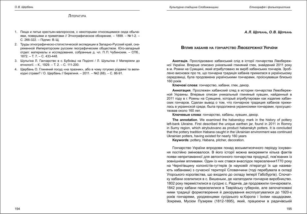 | Бібліографія: | Щербань А. Л., Щербань О. В. Вплив хабанів на гончарство Лівобережної України. Культурна спадщина Слобожанщини: зб. наук. ст. Число 26, Харків : Курсор, 2012. C. 195–201 |
