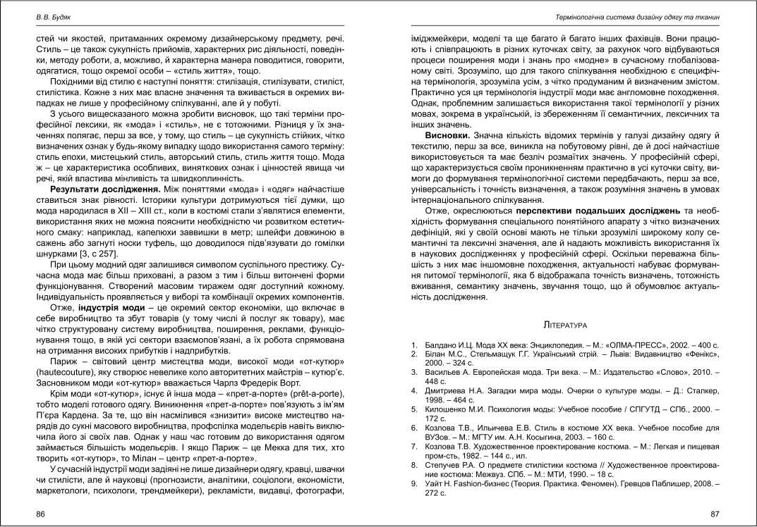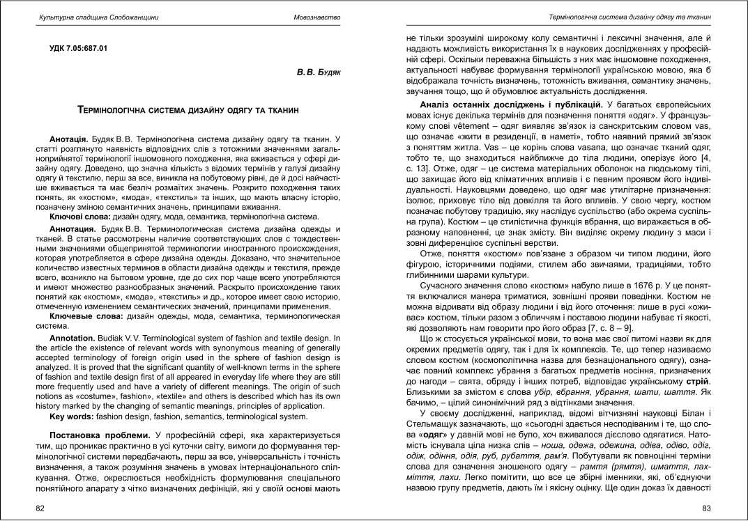 | Бібліографія: | Будяк В. В. Термінологічна система дизайну одягу та тканин. Культурна спадщина Слобожанщини: зб. наук. ст. Число 26, Харків : Курсор, 2012. C. 82–87 |