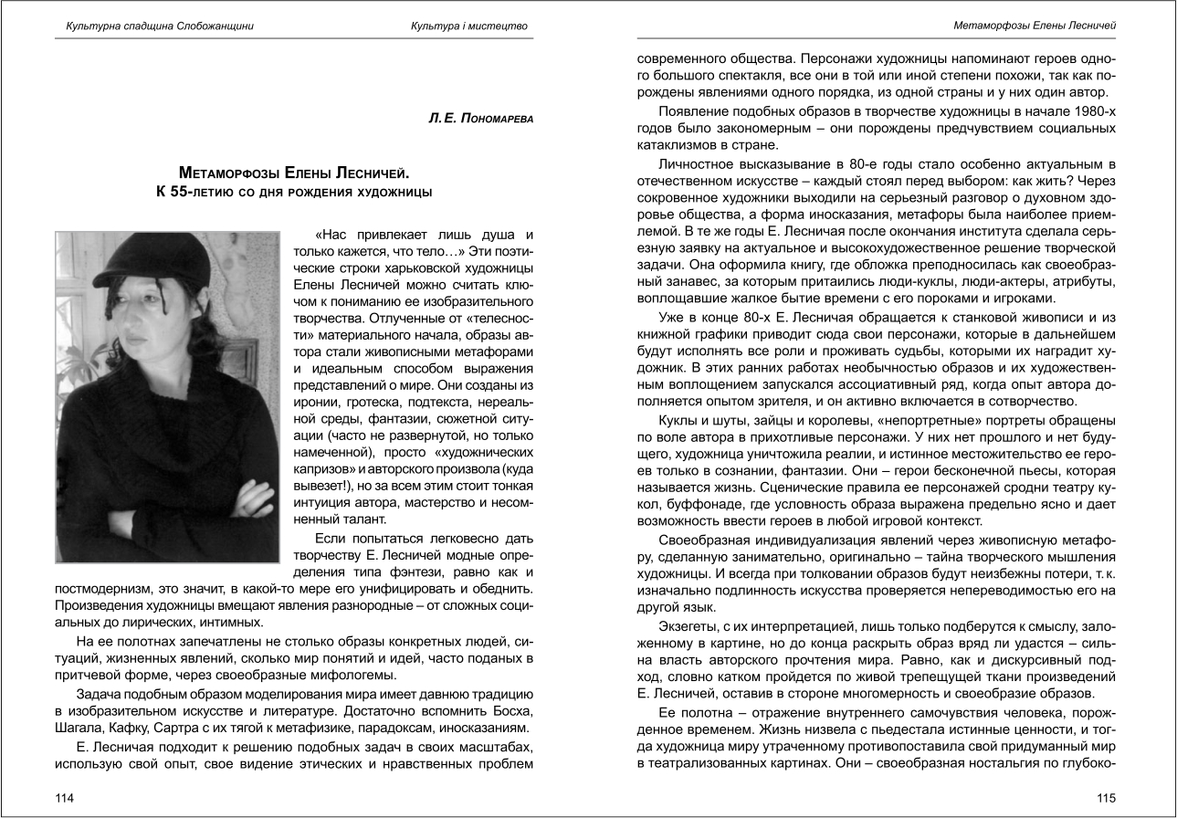 | Назва статті: | Метаморфозы Елены Лесничей. К 55-летию со дня рождения художницы |