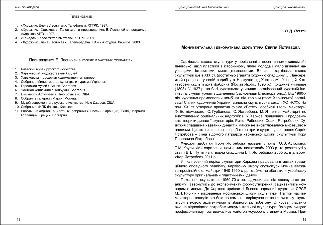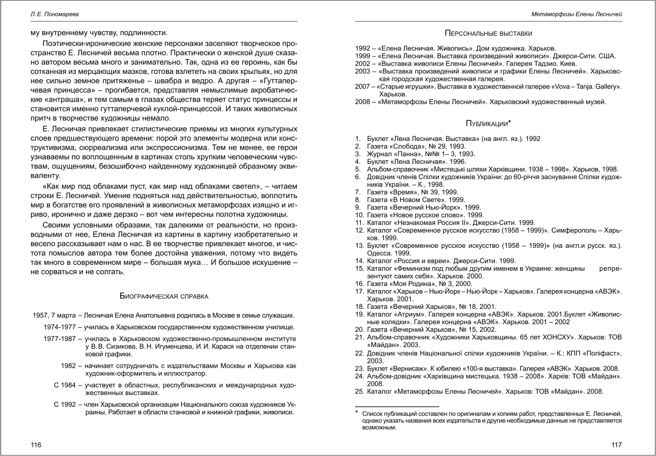 | Бібліографія: | Пономарьова Л. Є. Метаморфозы Елены Лесничей. К 55-летию со дня рождения художницы. Культурна спадщина Слобожанщини: зб. наук. ст. Число 27, Харків : Курсор, 2013. C. 114–118 , іл. |