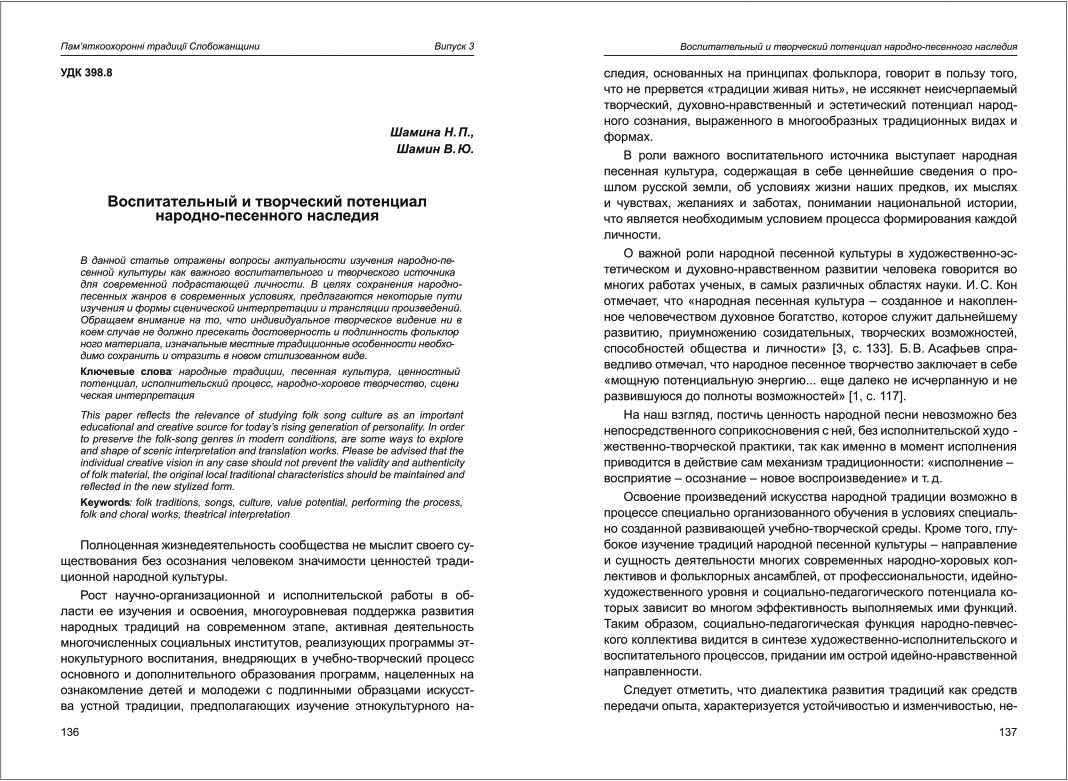 | Бібліографія: | Шамін В. Ю., Шаміна Н. П. Воспитательный и творческий потенциал народно-песенного наследия. Пам'яткознавчі погляди молодих вчених XXI ст.: зб. наук. ст. Випуск III, Харків : Курсор, 2013. C. 136–139 |