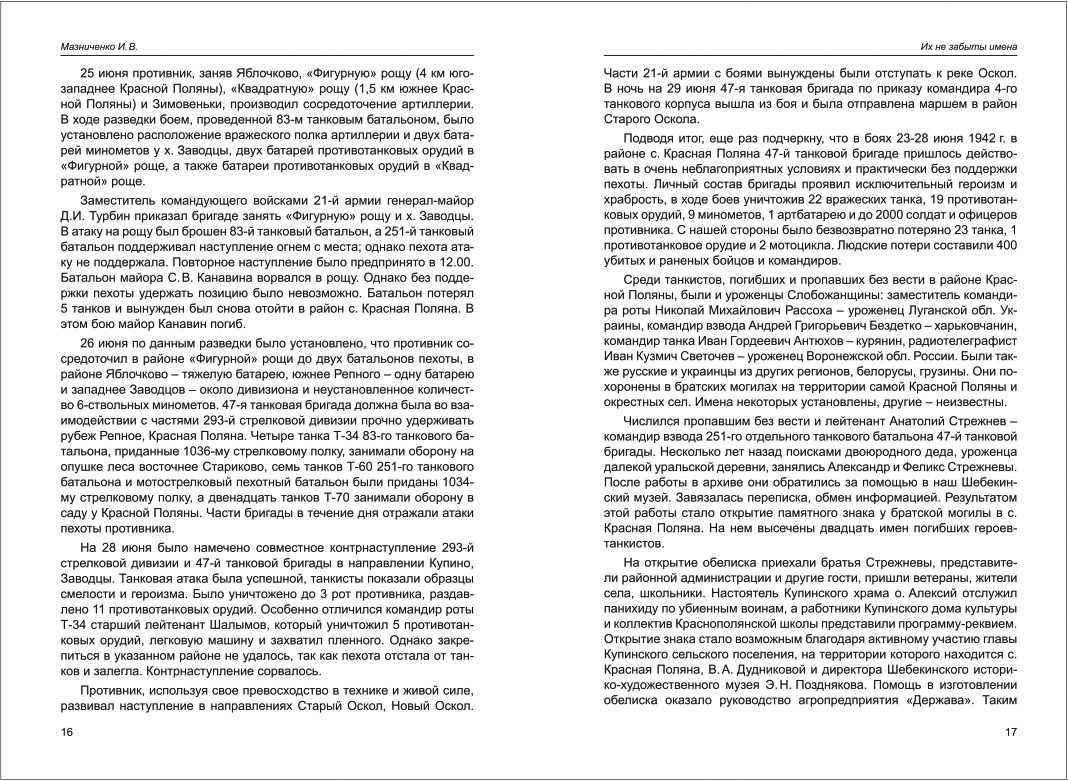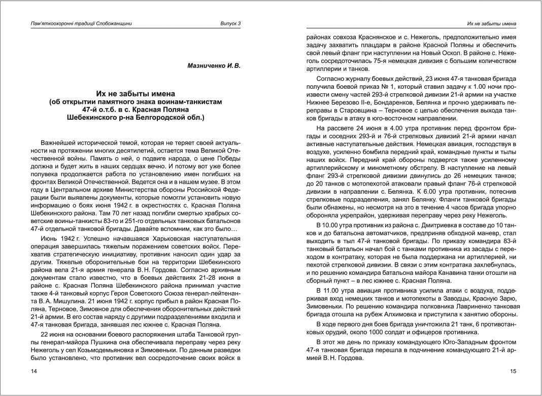| Бібліографія: | Мазниченко І. В. Их не забыты имена (об открытии памятного знака воинам-танкистам 47-й о.т.б. в с. Красная Поляна Шебекинского р-на Белгородской обл.). Пам'яткознавчі погляди молодих вчених XXI ст.: зб. наук. ст. Випуск III, Харків : Курсор, 2013. C. 14–18 |