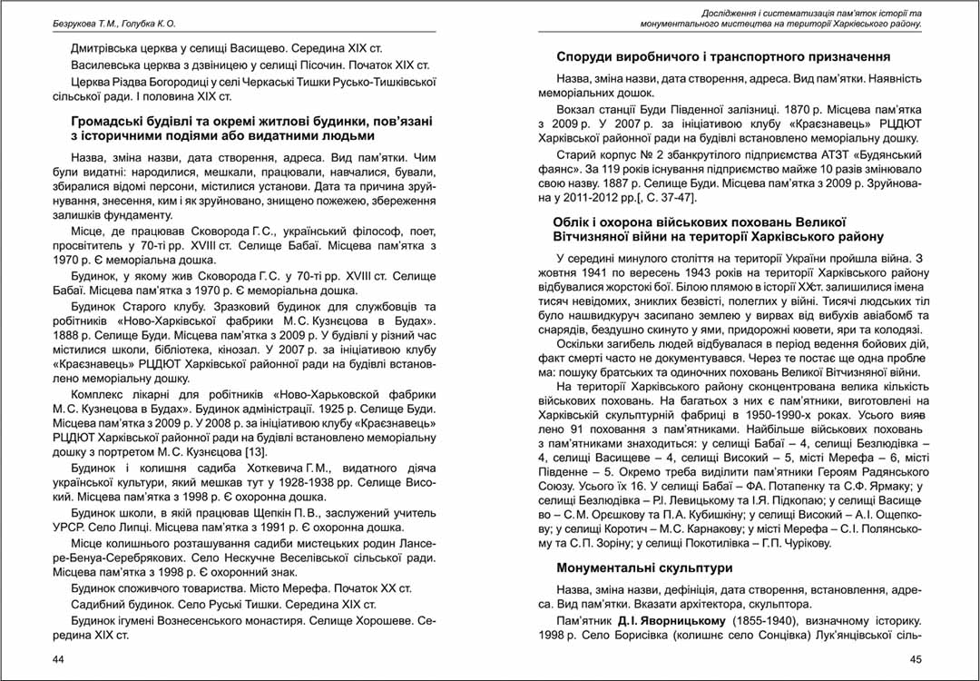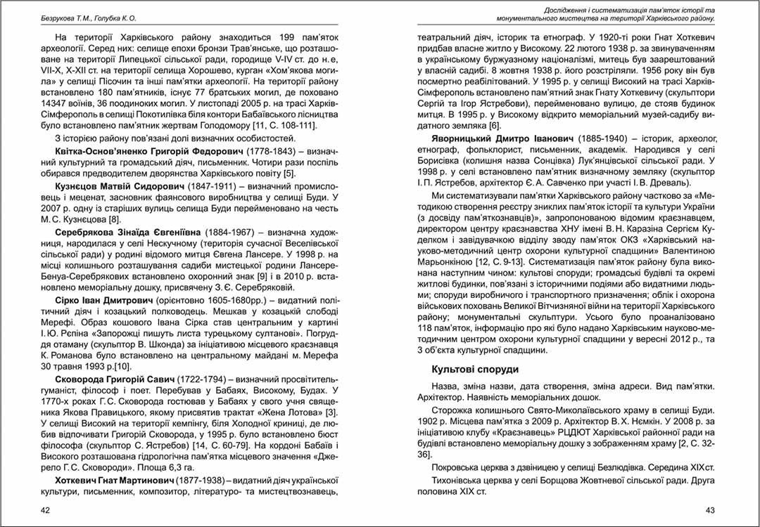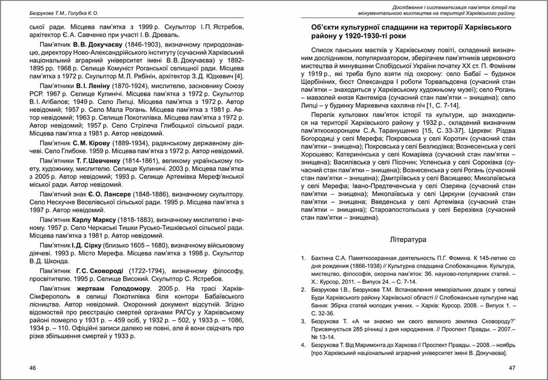| Бібліографія: | Безрукова Т. М., Голубка К. О. Дослідження і систематизація пам'яток історії та монументального мистецтва на території Харківського району. До 90-річчя заснування району. Пам'яткознавчі погляди молодих вчених XXI ст.: зб. наук. ст. Випуск IV, Харків : Курсор, 2013. C. 41–48 |