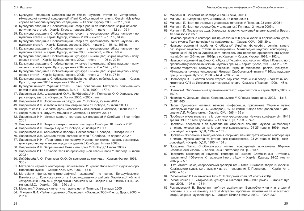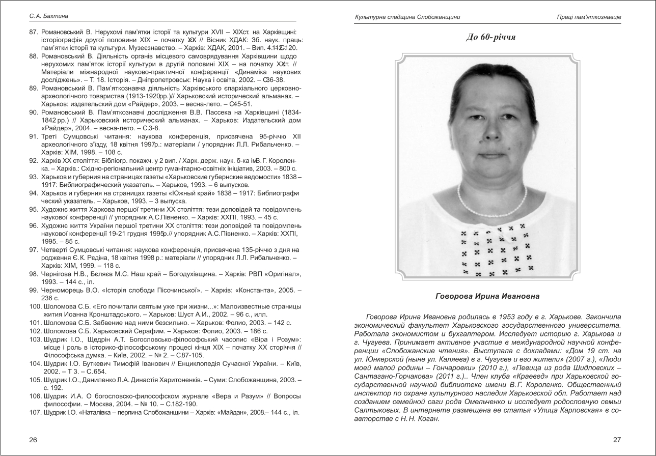 | Бібліографія: | Бахтіна С. А. Міжнародна наукова конференція "Слобожанські читання" за відновлення історичної пам'яті та збереження культурного надбання. Кінець 20 - початок 21 століття. Праці пам'яткознавців: зб. наук. ст. Випуск III Частина II, Харків : Курсор, 2014. C. 7–26 , іл. |