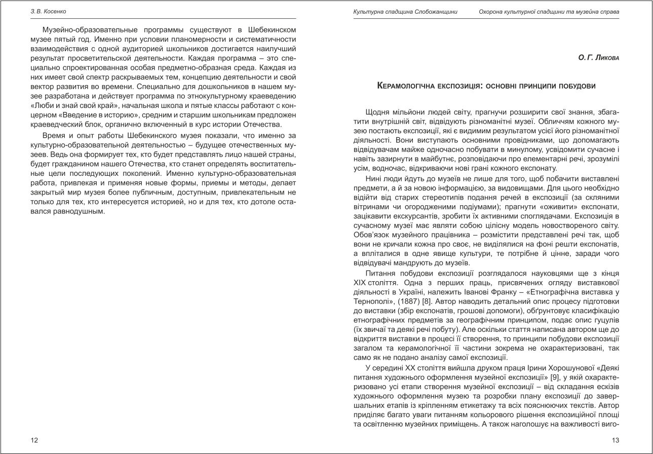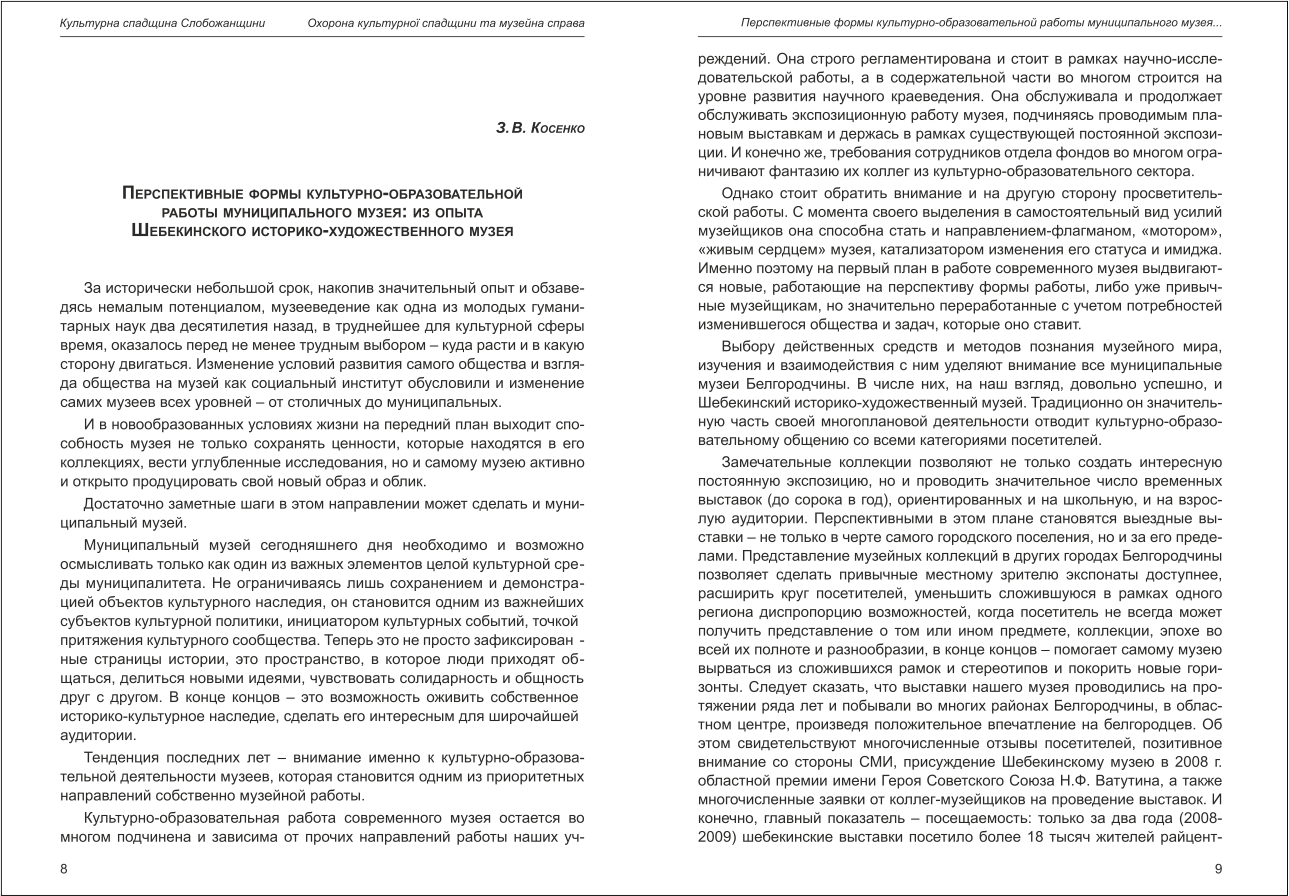 | Бібліографія: | Косенко З. В. Перспективные формы культурно-образовательной работы муниципального музея: из опыта Шебекинского историко-художественного музея. Культурна спадщина Слобожанщини: зб. наук. ст. Число 28, Харків : Курсор, 2014. C. 8–12 |