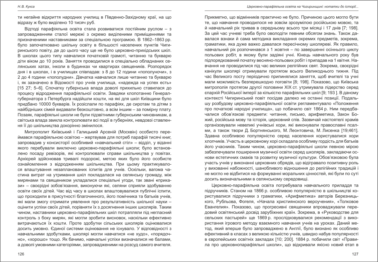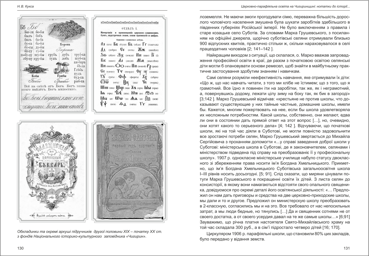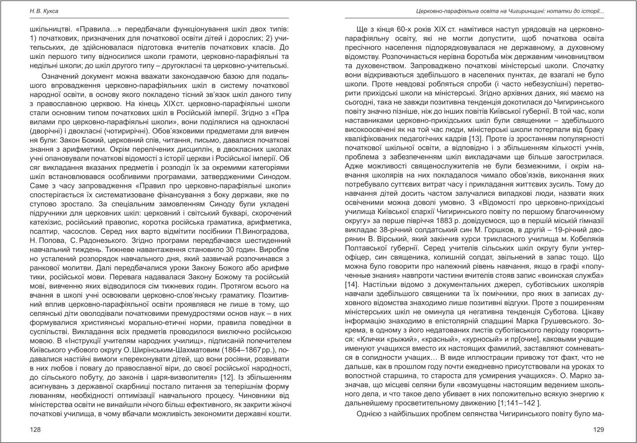 | Бібліографія: | Кукса Н. В. Церковно-парафіяльна освіта на Чигиринщині: нотатки до історії становлення та розбудови. Культурна спадщина Слобожанщини: зб. наук. ст. Число 28, Харків : Курсор, 2014. C. 125–132 |