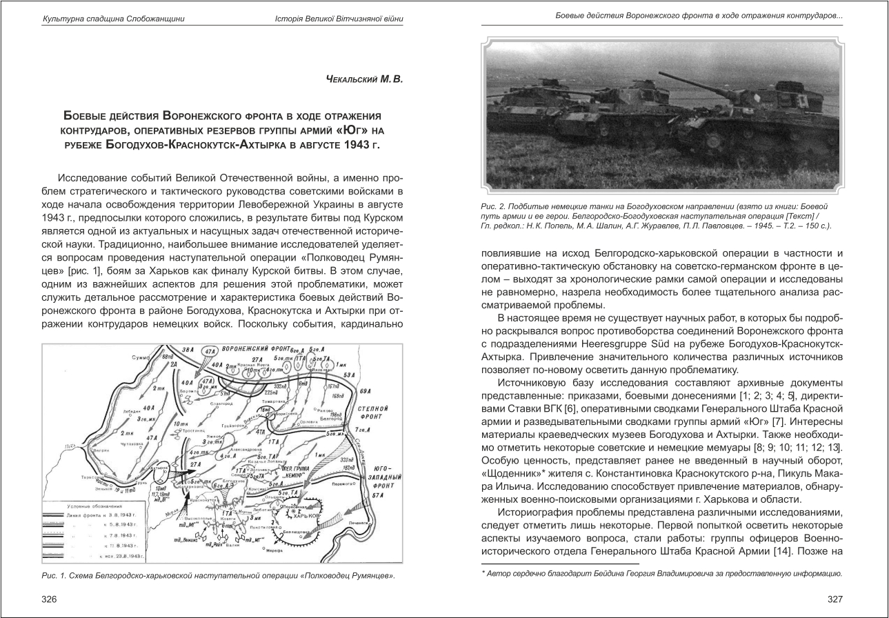 | Бібліографія: | Чекальский М. В. Боевые действия Воронежского фронта в ходе отражения контрударов, оперативных резервов группы армий "Юг" на рубеже Богодухов-Краснокутск-Ахтырка в августе 1943 г. Культурна спадщина Слобожанщини: зб. наук. ст. Число 28, Харків : Курсор, 2014. C. 326–335 , іл. |