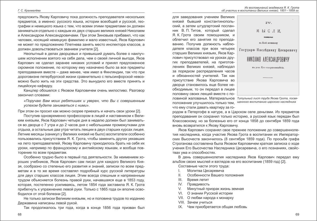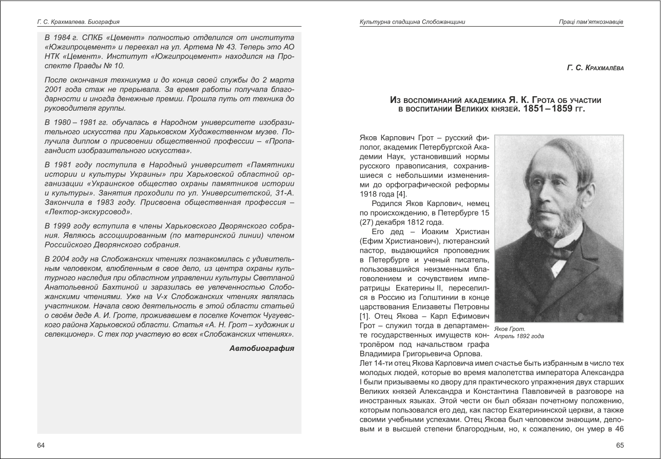 | Бібліографія: | Крахмальова Г. С. Из воспоминаний академика Я. К. Грота об участии в воспитании Великих князей. 1851 - 1859 гг. Праці пам'яткознавців: зб. наук. ст. Випуск IV, Харків : Курсор, 2015. C. 65–70 , іл. |
