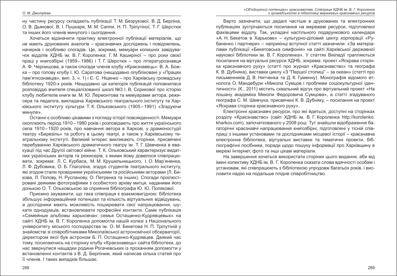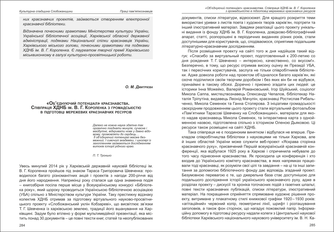 | Назва статті: | Об'єднуючий потенціал краєзнавства. Співпраця ХДНБ ім. В.Г. Короленка з громадськістю в підготовці мережевих краєзнавчих ресурсів |