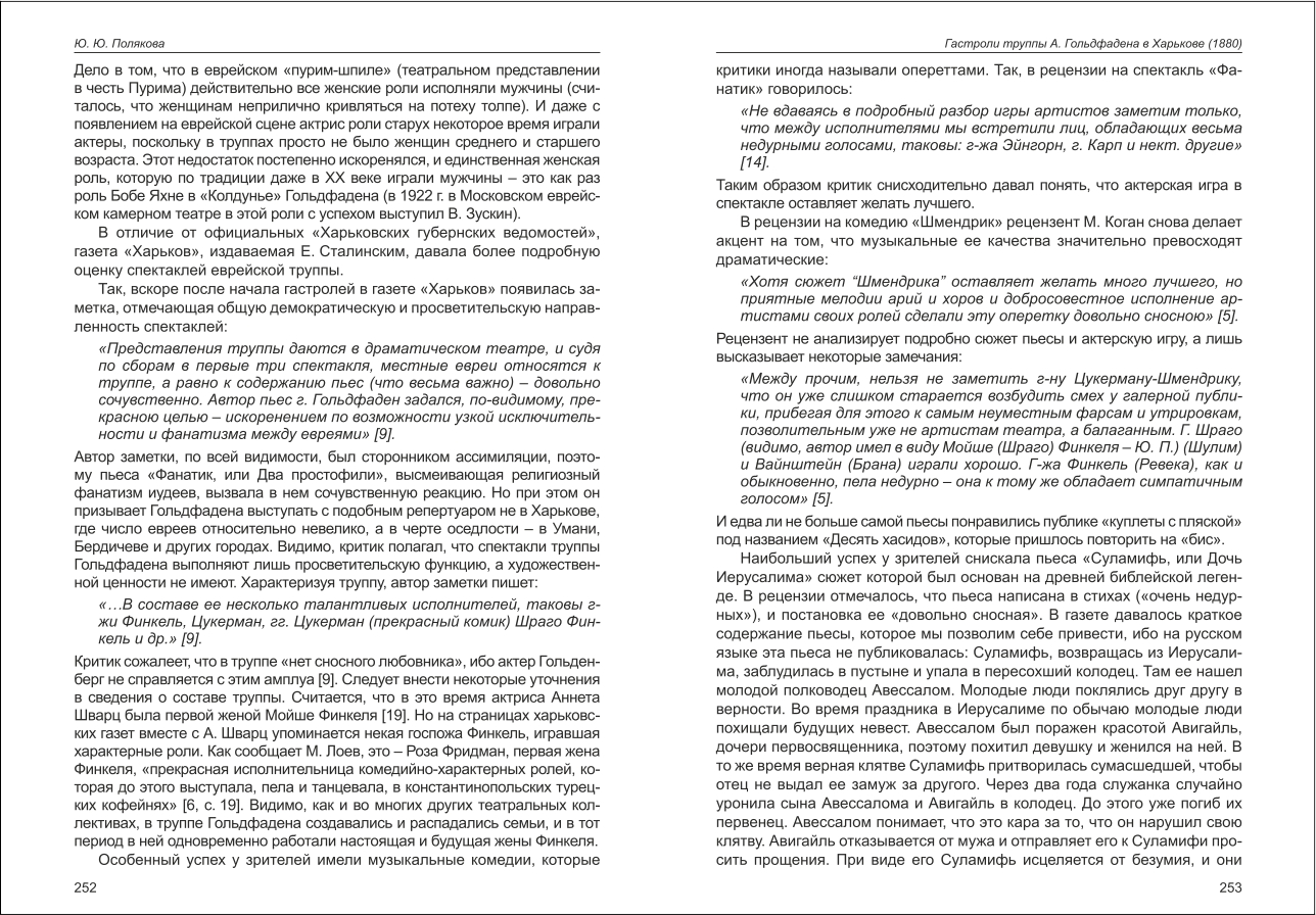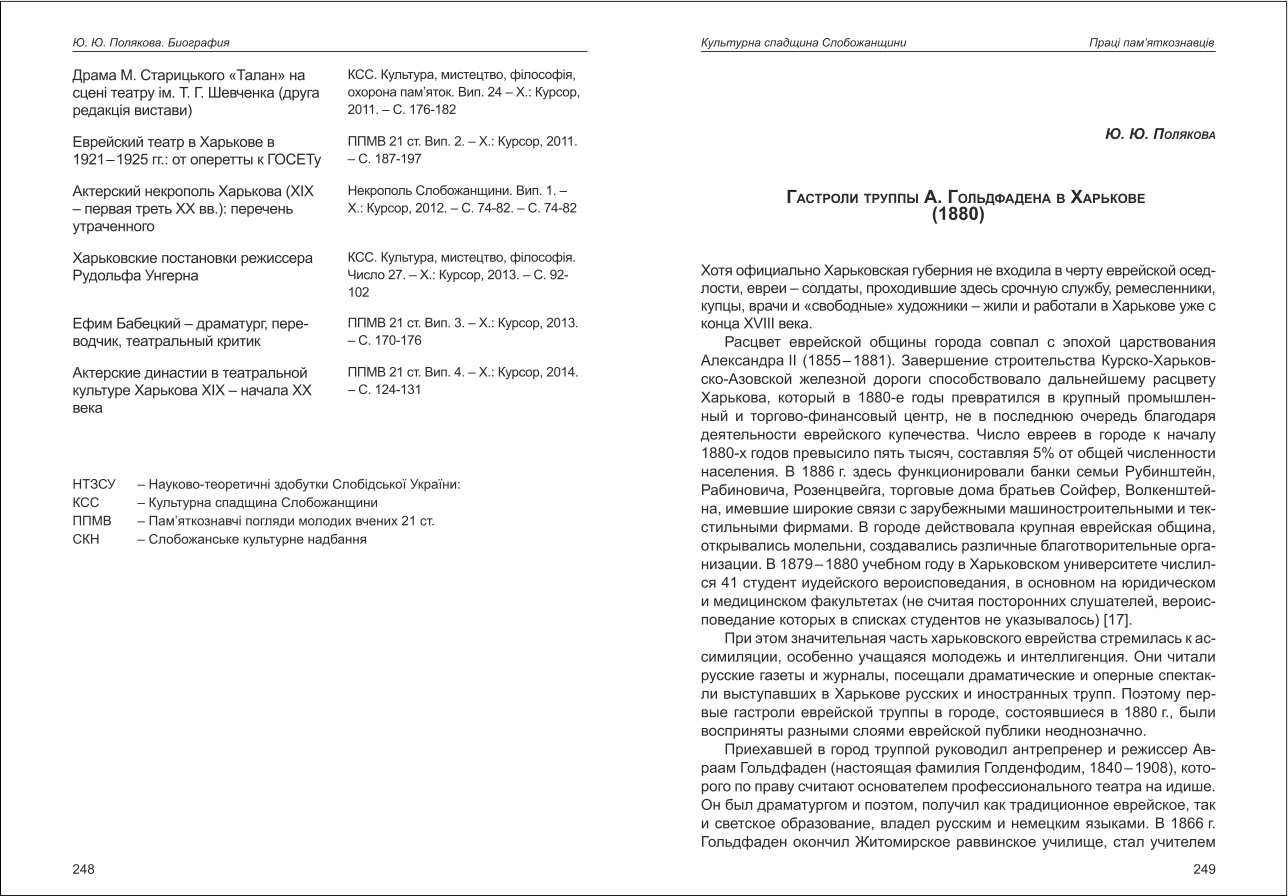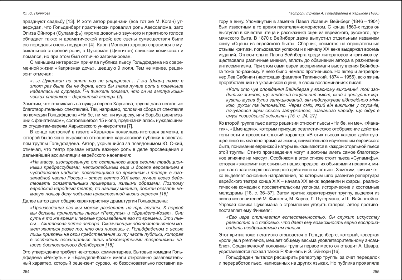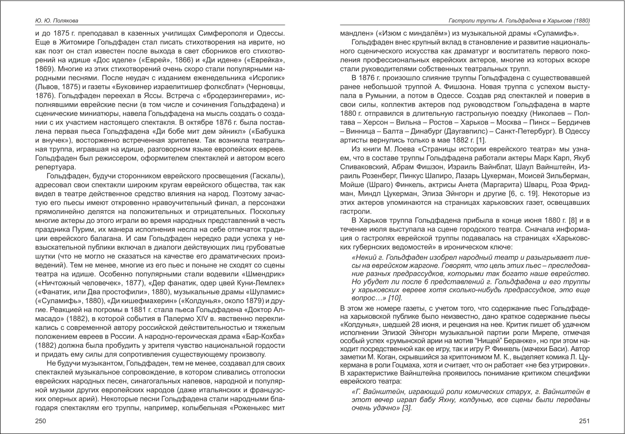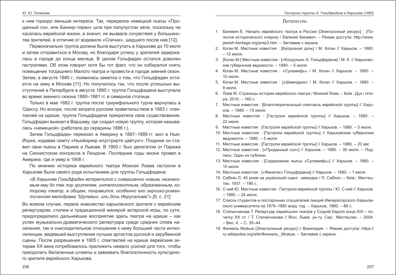 | Бібліографія: | Полякова Ю. Ю. Гастроли труппы А. Гольдфадена в Харькове (1880). Праці пам'яткознавців: зб. наук. ст. Випуск IV, Харків : Курсор, 2015. C. 249–257 |