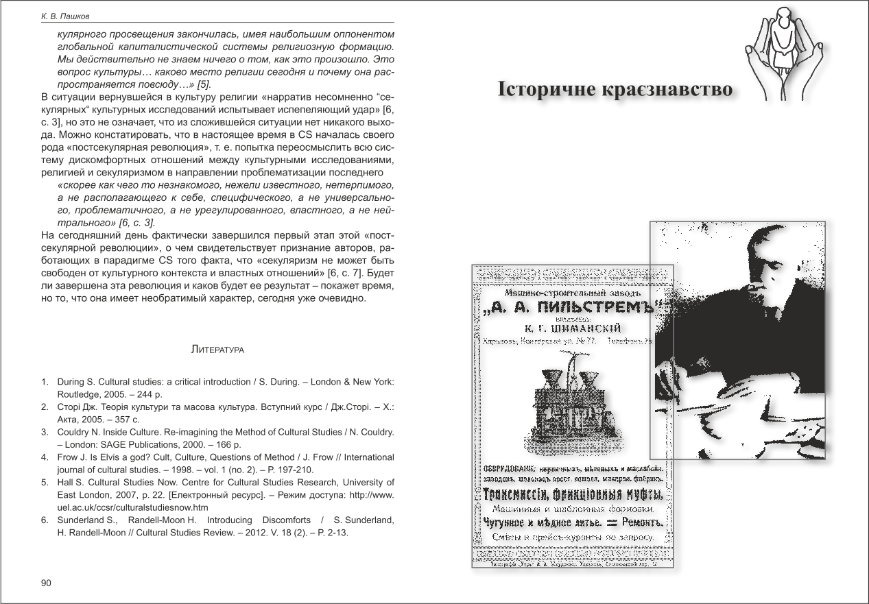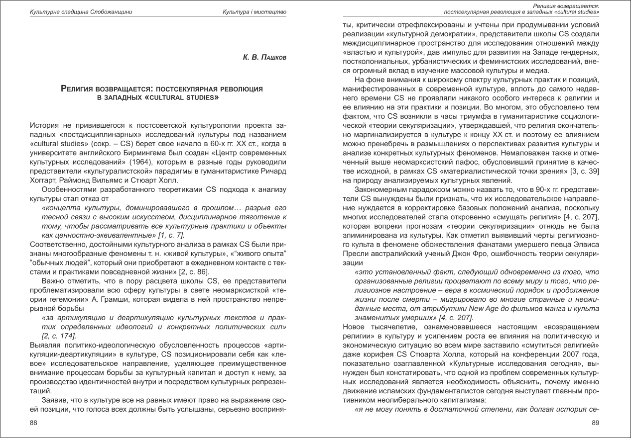 | Бібліографія: | Пашков К. В. Религия возвращается: постсекулярная революция в западных "cultural studies". Культурна спадщина Слобожанщини: зб. наук. ст. Число 29, Харків : Курсор, 2016. C. 88–90 |