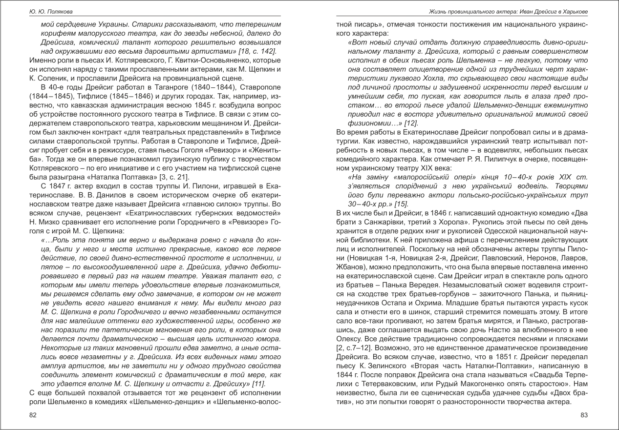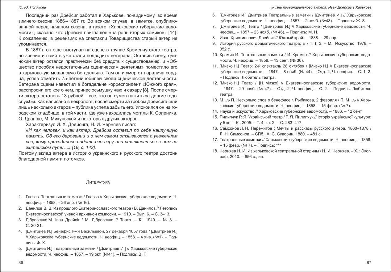 | Бібліографія: | Полякова Ю. Ю. Жизнь провинциального актёра: Иван Дрейсиг в Харькове. Культурна спадщина Слобожанщини: зб. наук. ст. Число 29, Харків : Курсор, 2016. C. 81–87 |