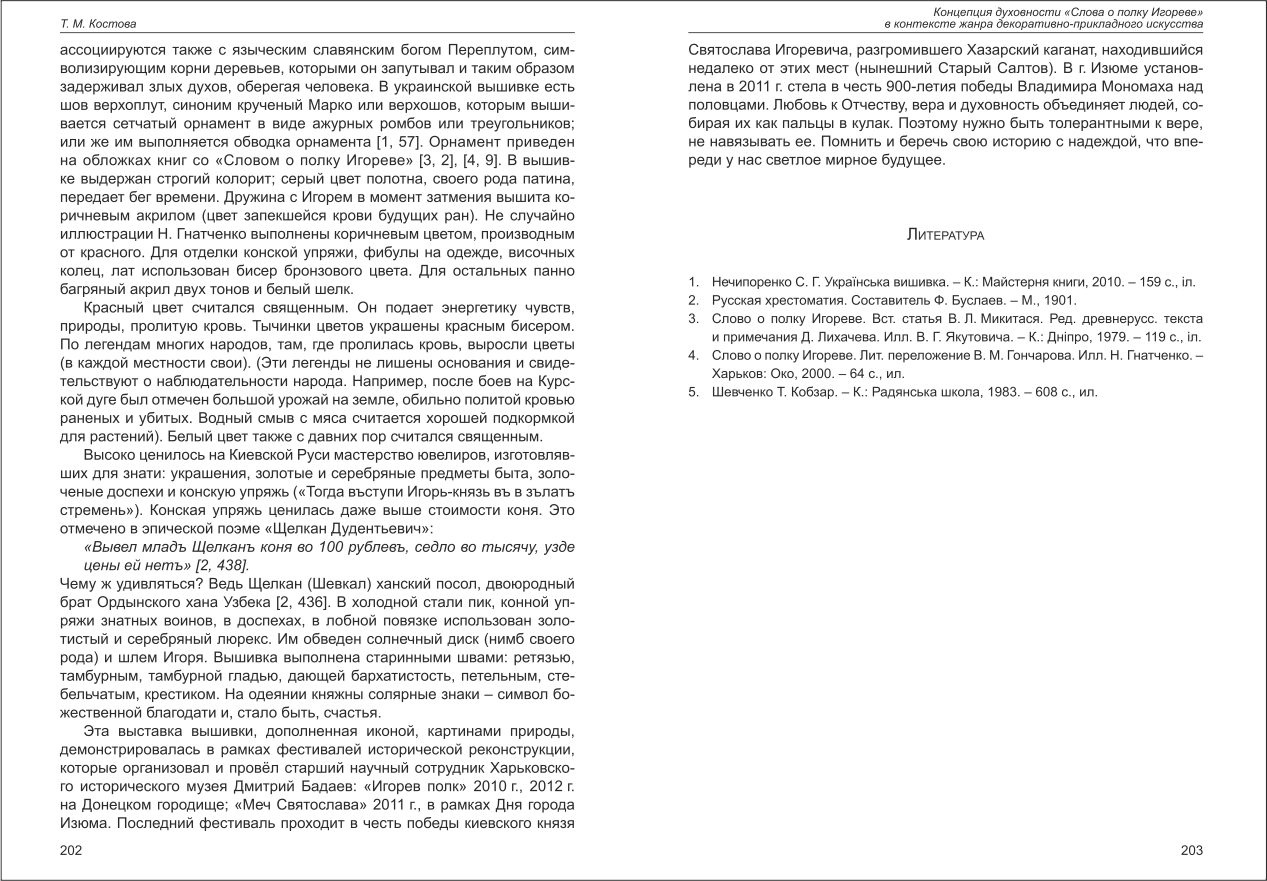 | Бібліографія: | Костова Т. М. Концепция духовности "Слова о полку Игореве" в контексте жанра декоративно-прикладного искусства. Культурна спадщина Слобожанщини: зб. наук. ст. Число 29, Харків : Курсор, 2016. C. 198–203 |
