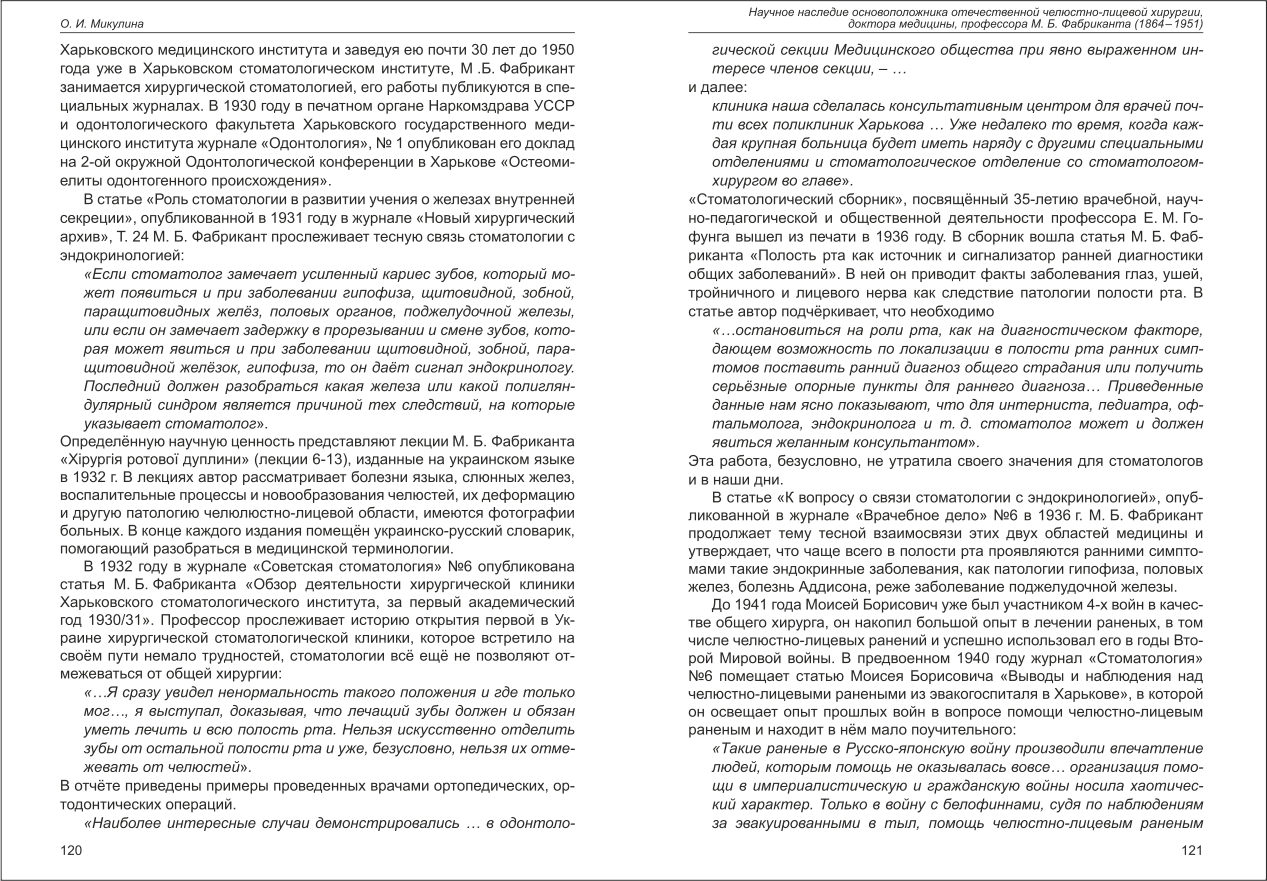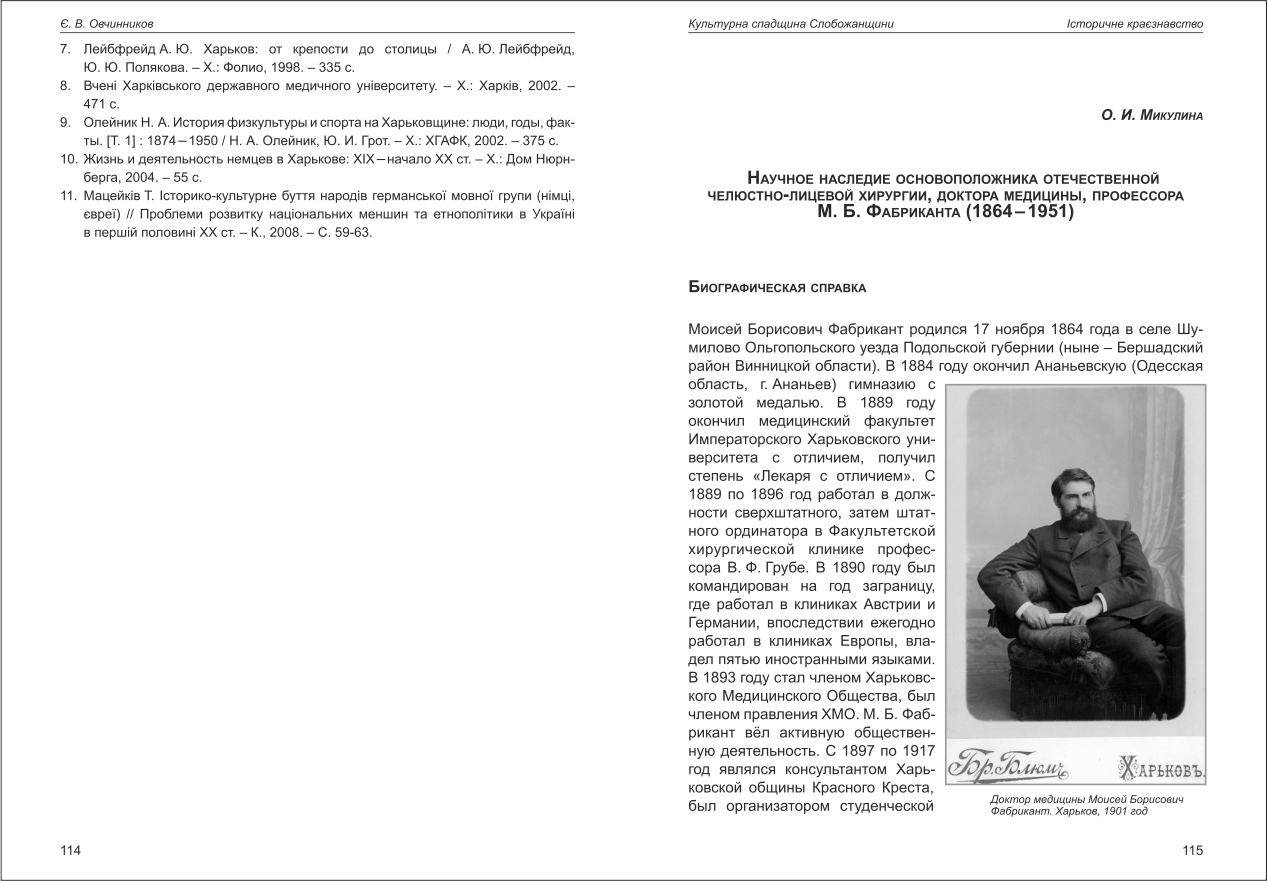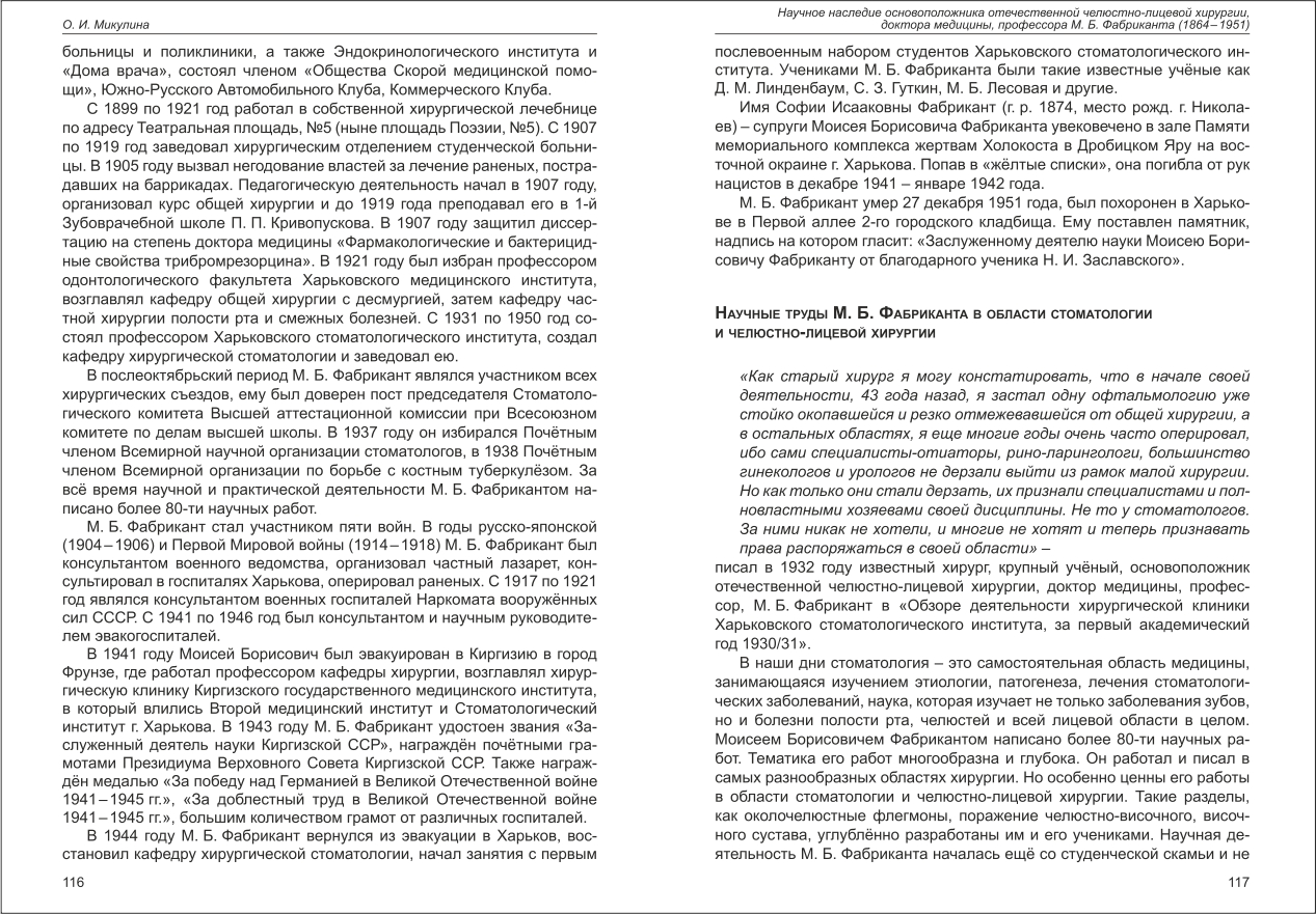 | Бібліографія: | Мікуліна О. І. Научное наследие основоположника отечественной челюстно-лицевой хирургии, доктора медицины, профессора М. Б. Фабриканта (1864-1951). Культурна спадщина Слобожанщини: зб. наук. ст. Число 29, Харків : Курсор, 2016. C. 115–124 , іл. |