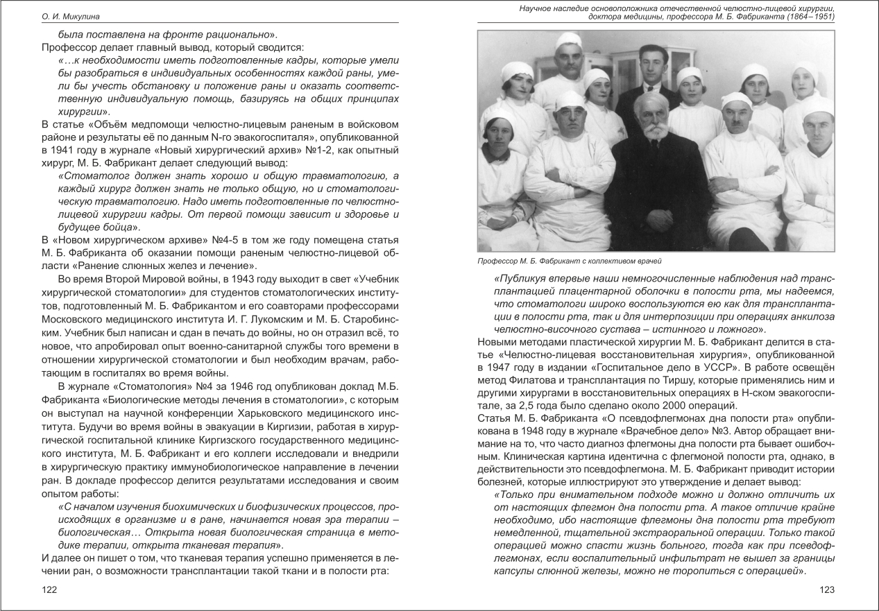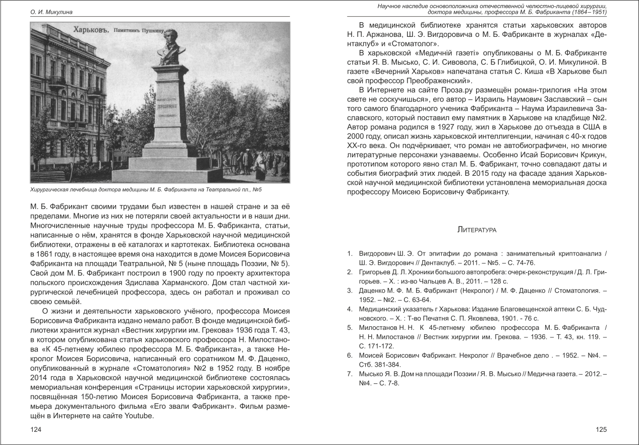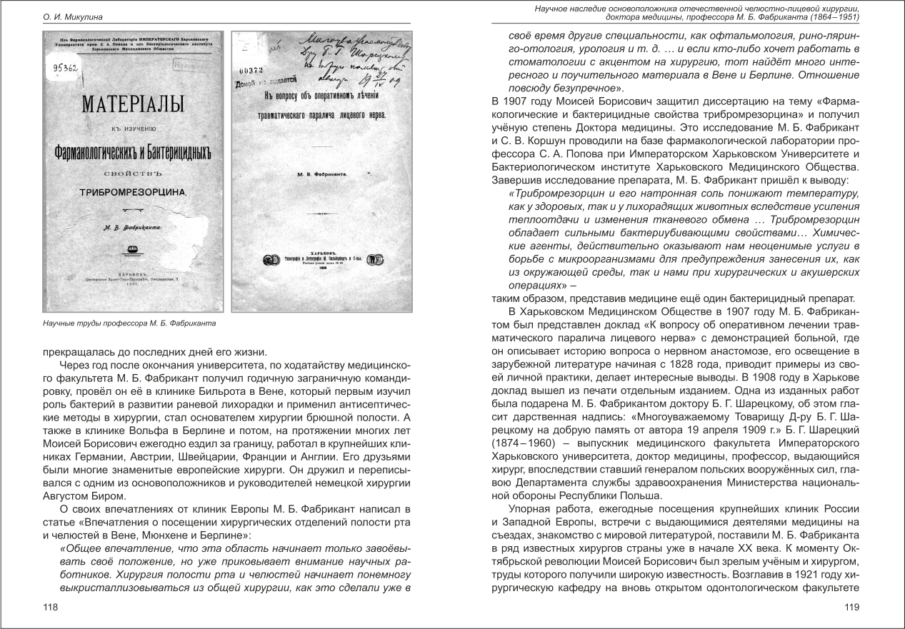 | Бібліографія: | Мікуліна О. І. Научное наследие основоположника отечественной челюстно-лицевой хирургии, доктора медицины, профессора М. Б. Фабриканта (1864-1951). Культурна спадщина Слобожанщини: зб. наук. ст. Число 29, Харків : Курсор, 2016. C. 115–124 , іл. |