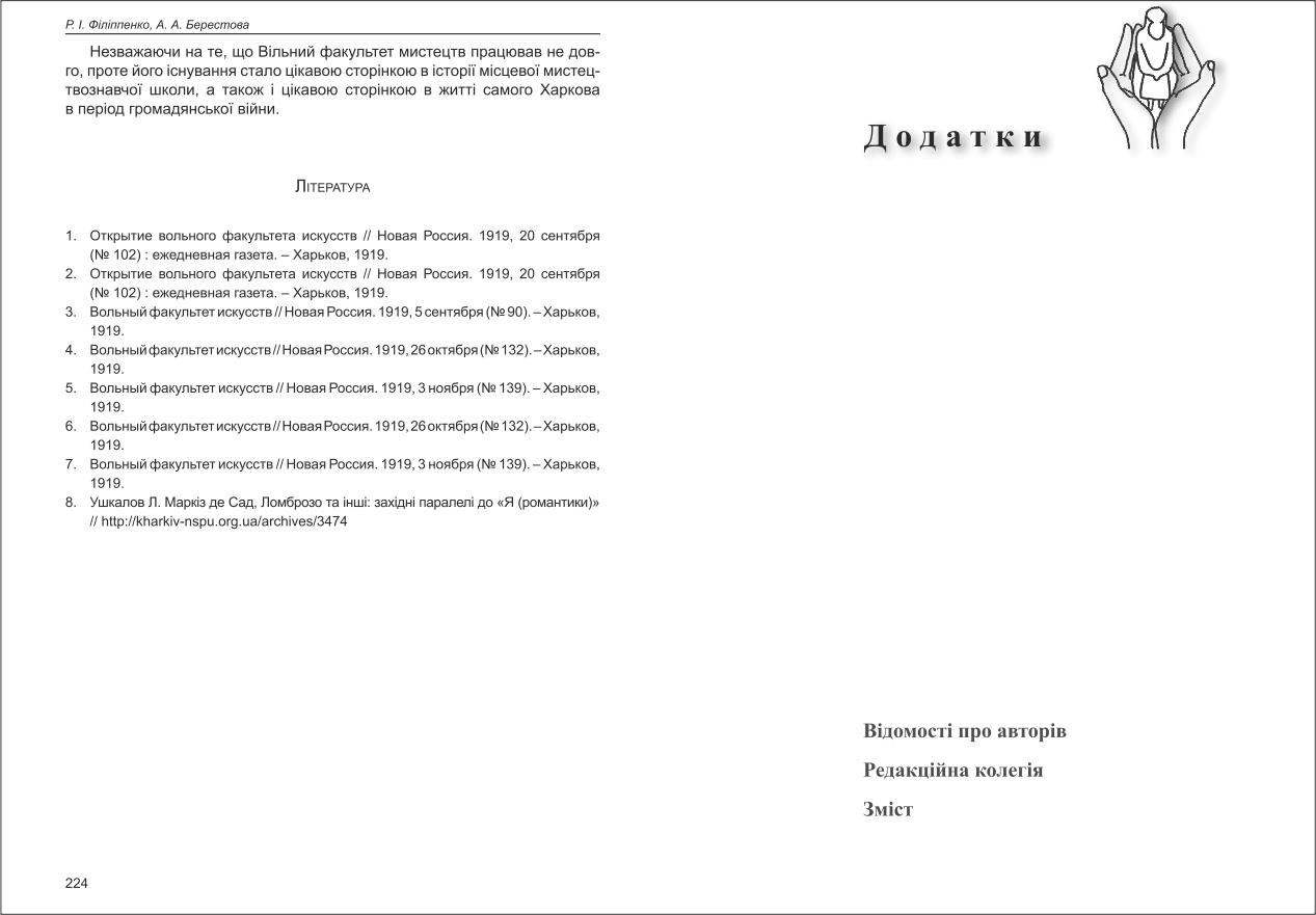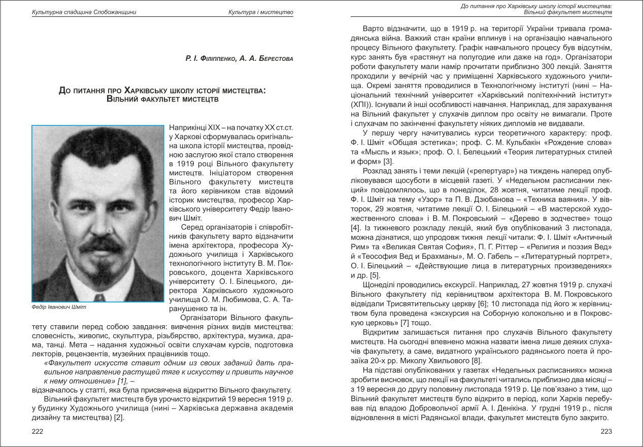 | Бібліографія: | Берестова А. А., Філіппенко Р. І. До питання про Харківську школу історії мистецтва: Вільний факультет мистецтв. Культурна спадщина Слобожанщини: зб. наук. ст. Число 31, Харків : Курсор, 2016. C. 222–224 , іл. |