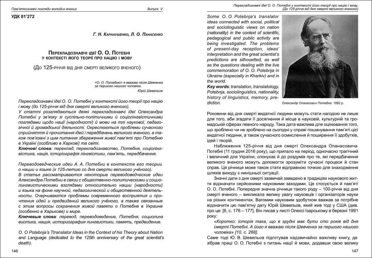 | Бібліографія: | Білоконь О. В., Карнаушенко Г. Н. Перекладознавчі ідеї О. О. Потебні у контексті його теорії про націю і мову. (До 125-річчя від дня смерті великого вченого). Пам'яткознавчі погляди молодих вчених XXI ст.: зб. наук. ст. Випуск V, Харків : Курсор, 2016. C. 146–155 , іл. |