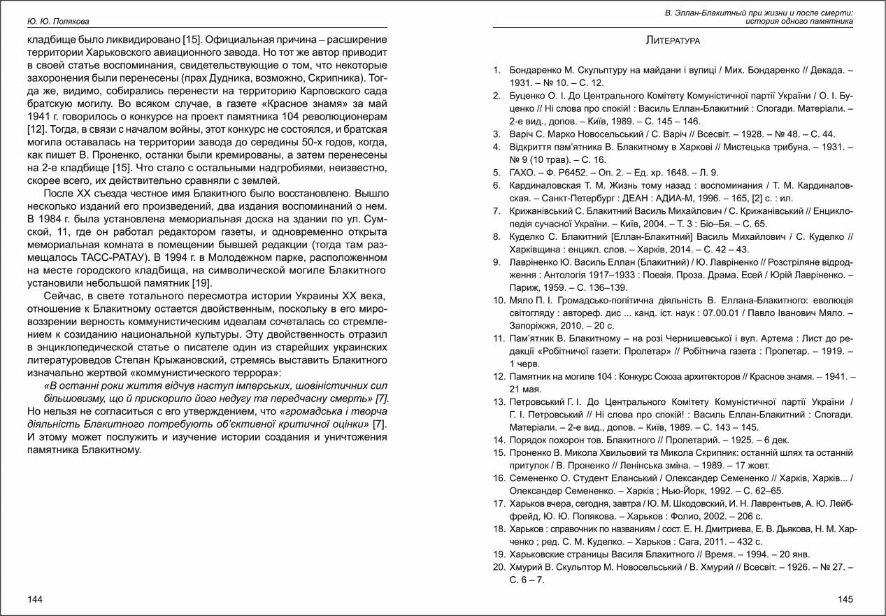 | Бібліографія: | Полякова Ю. Ю. В. Эллан-Блакитный при жизни и после смерти: история одного памятника. Пам'яткознавчі погляди молодих вчених XXI ст.: зб. наук. ст. Випуск V, Харків : Курсор, 2016. C. 137–144 , іл. |