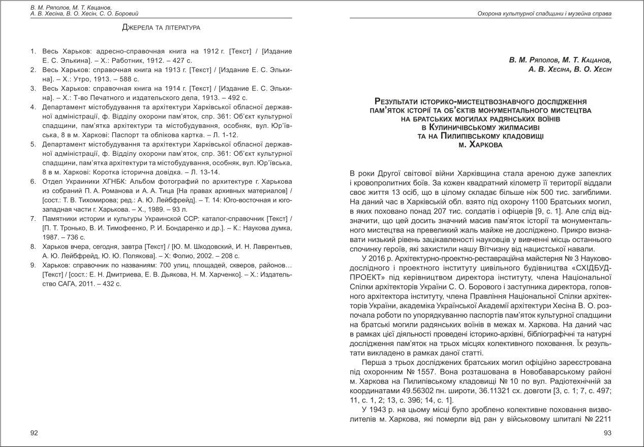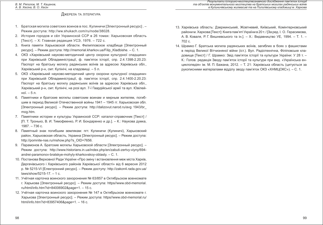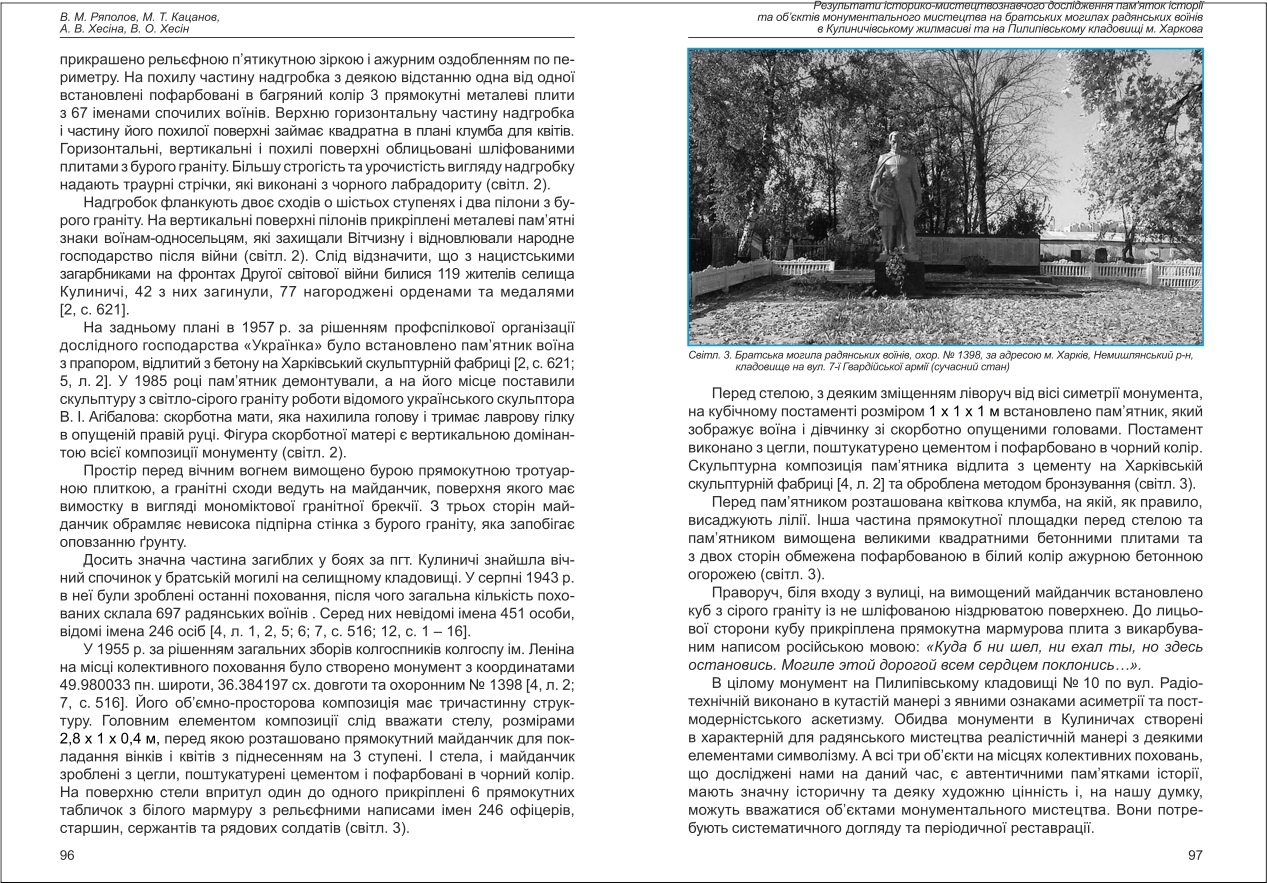 | Назва статті: | Результати історико-мистецтвознавчого дослідження пам'яток історії та об'єктів монументального мистецтва на братських могилах радянських воїнів в Кулиничівському жилмасиві та на Пилипівському кладовищі м. Харкова |