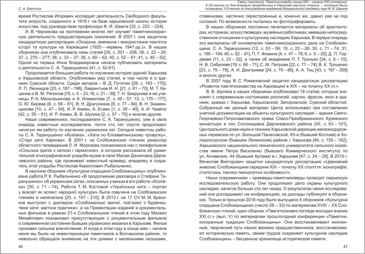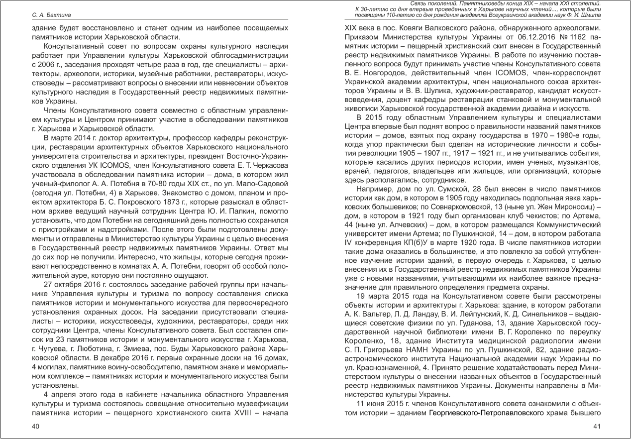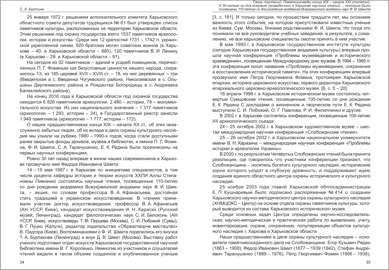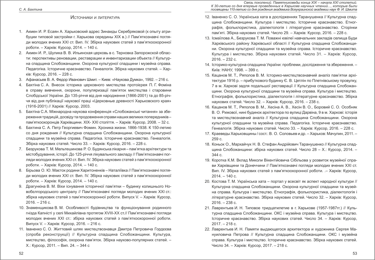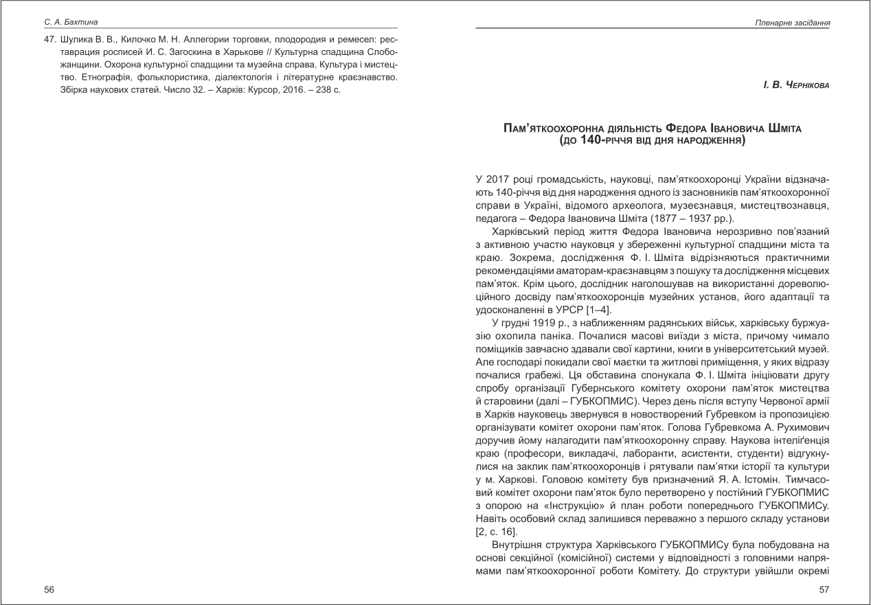 | Бібліографія: | Бахтіна С. А. Связь поколений. Памятниковеды конца XIX - начала XXI столетий: к 30-летию со дня впервые проведенных в Харькове научных чтений (14-15 мая 1987 р.)..., которые были посвящены 110-летию со дня рождения академика Всеукраинской академии наук Ф. И. Шмита. Культурна спадщина Слобожанщини: зб. наук. ст. Число 35, Харків : Курсор, 2017. C. 29–61 , іл. |