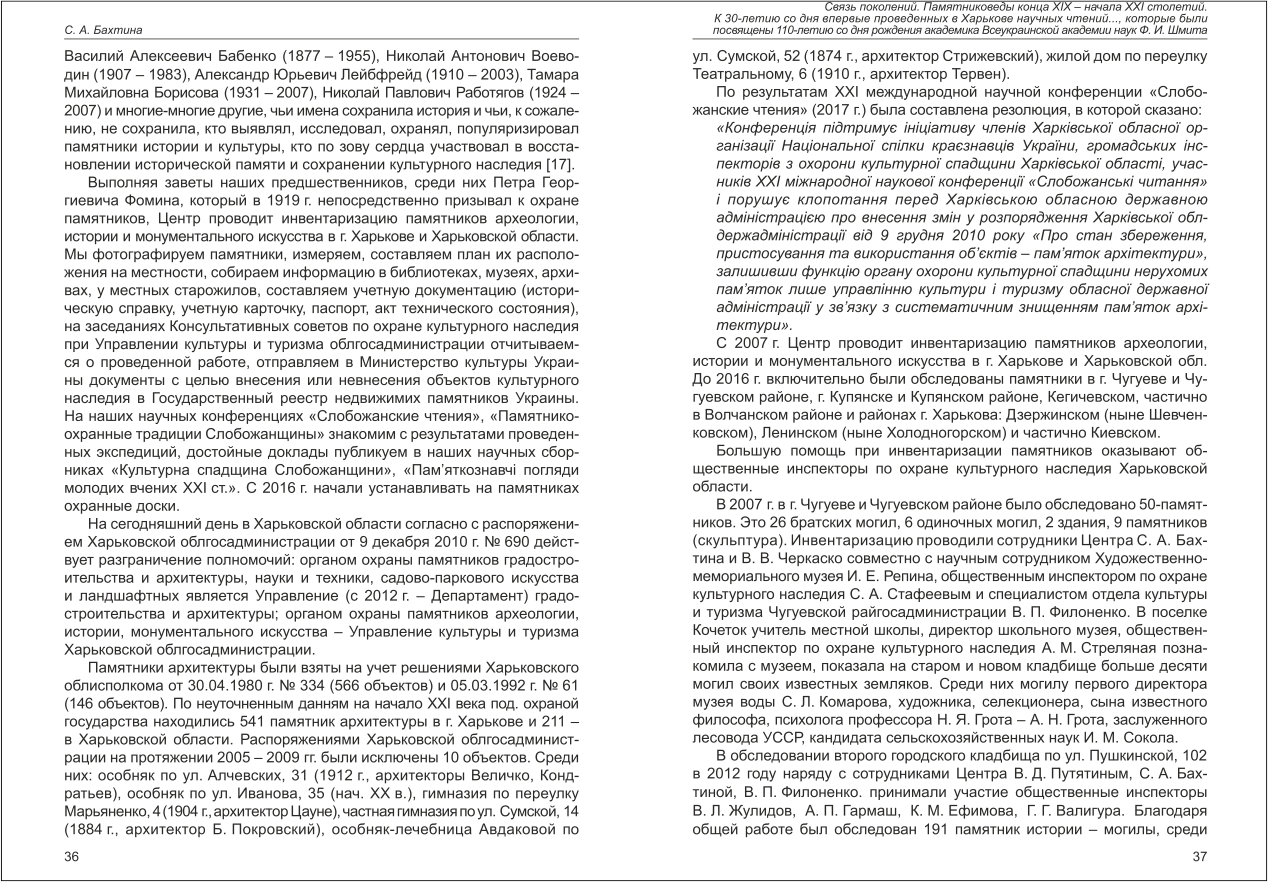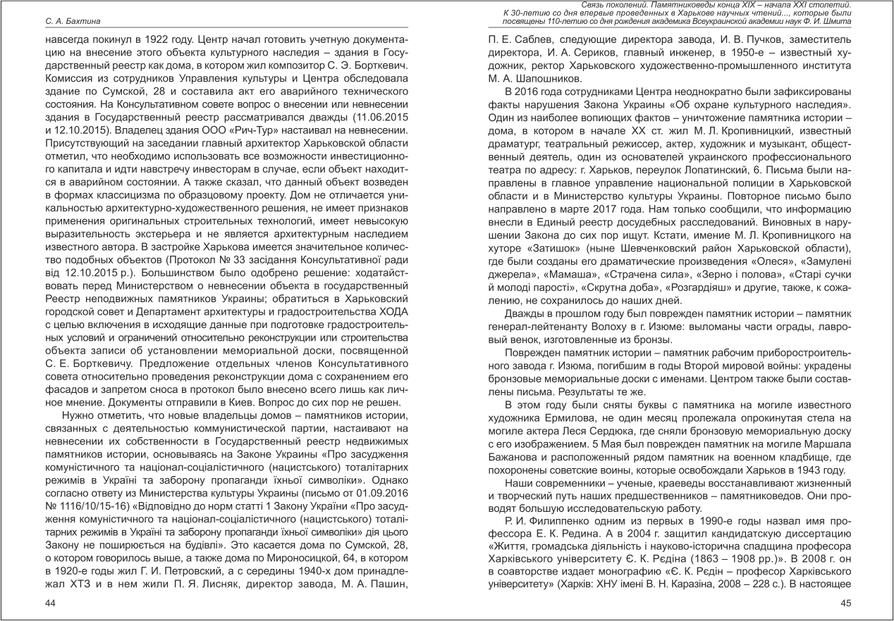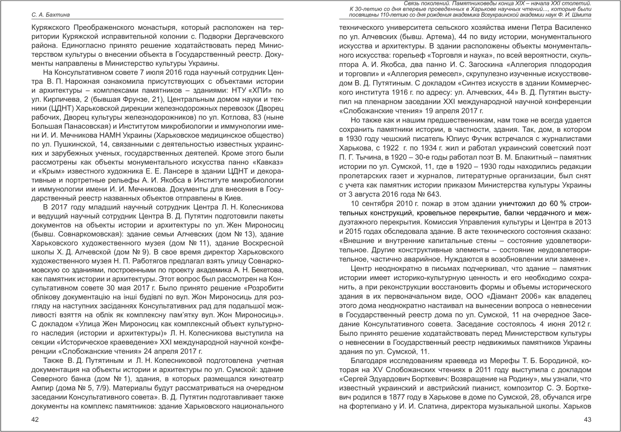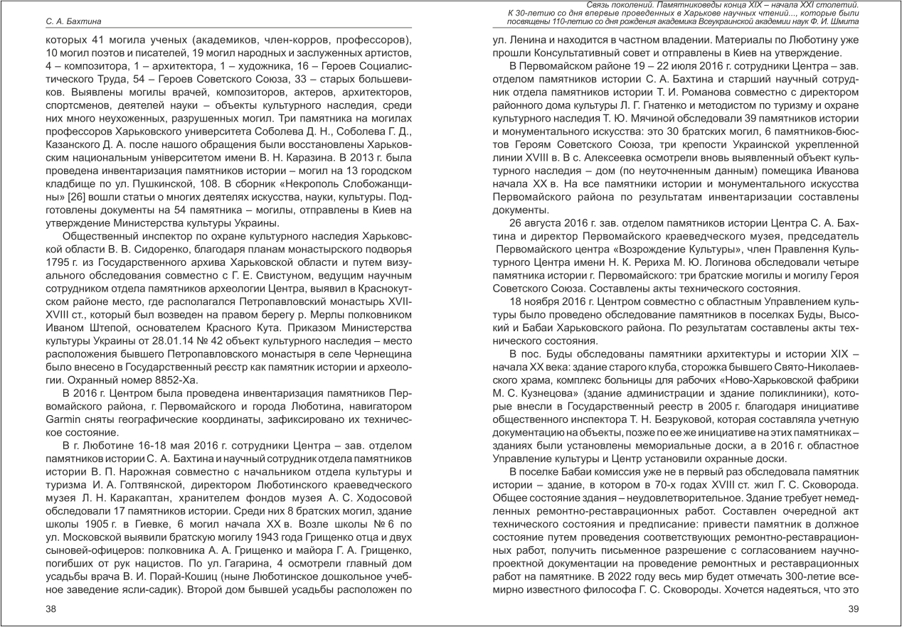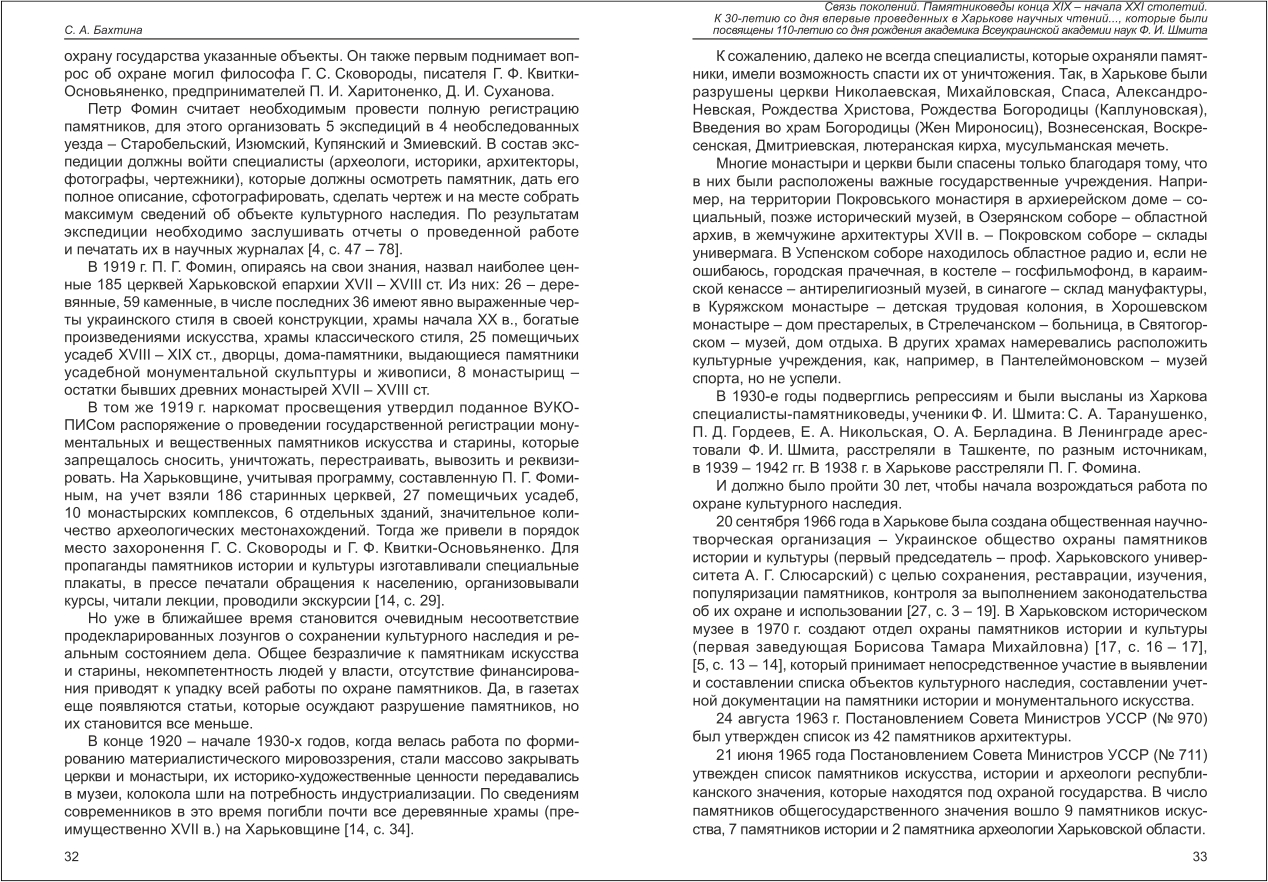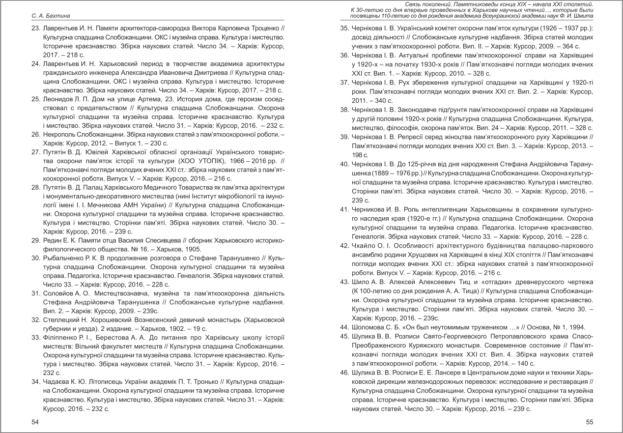 | Бібліографія: | Бахтіна С. А. Связь поколений. Памятниковеды конца XIX - начала XXI столетий: к 30-летию со дня впервые проведенных в Харькове научных чтений (14-15 мая 1987 р.)..., которые были посвящены 110-летию со дня рождения академика Всеукраинской академии наук Ф. И. Шмита. Культурна спадщина Слобожанщини: зб. наук. ст. Число 35, Харків : Курсор, 2017. C. 29–61 , іл. |