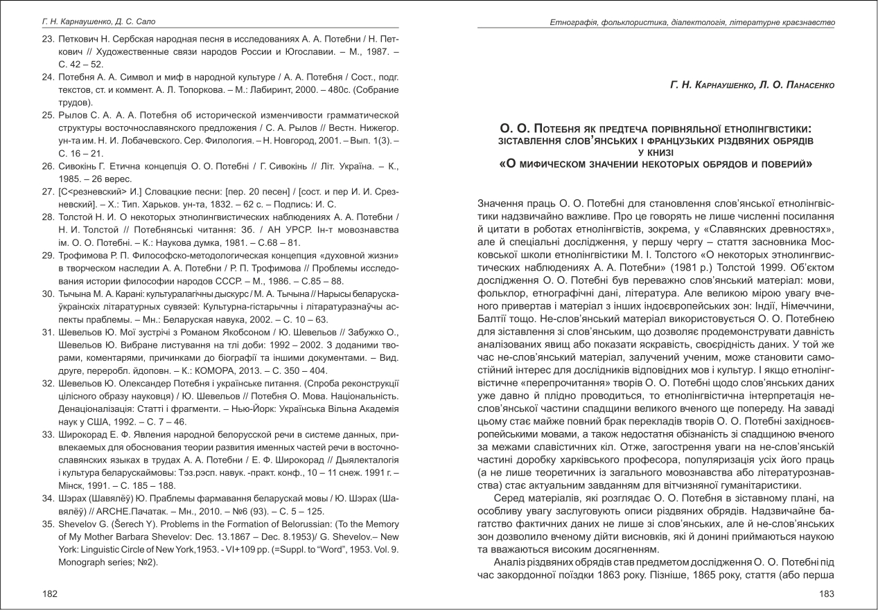 | Бібліографія: | Білоконь О. В., Карнаушенко Г. Н. О. О. Потебня як предтеча порівняльної етнолінгвістики: зіставлення слов'янськх і французських ряздвяних обрядів у книзі "О мифическом значении некоторых обрядов и поверий". Культурна спадщина Слобожанщини: зб. наук. ст. Число 37, Харків : Курсор, 2018. C. 183–188 |