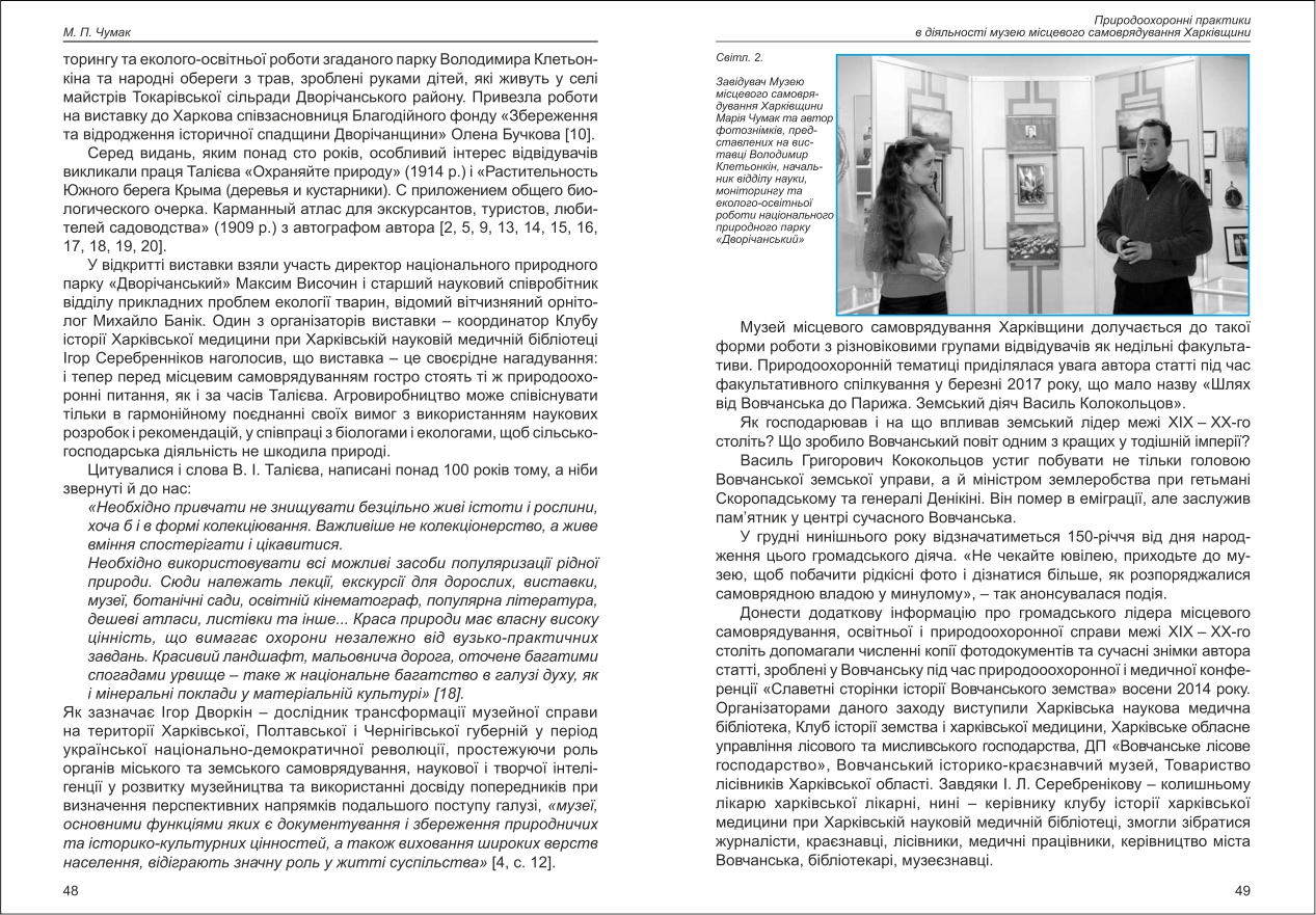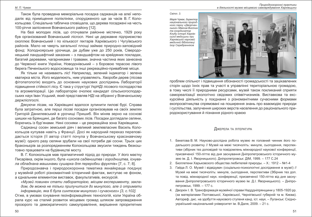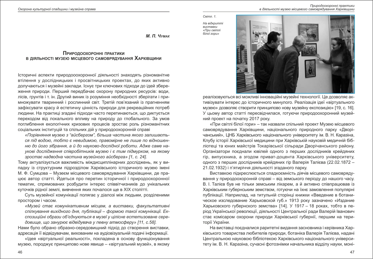 | Бібліографія: | Чумак М. П. Природоохоронні практики в діяльності музею місцевого самоврядування Харківщини. Культурна спадщина Слобожанщини: зб. наук. ст. Число 37, Харків : Курсор, 2018. C. 46–52 |