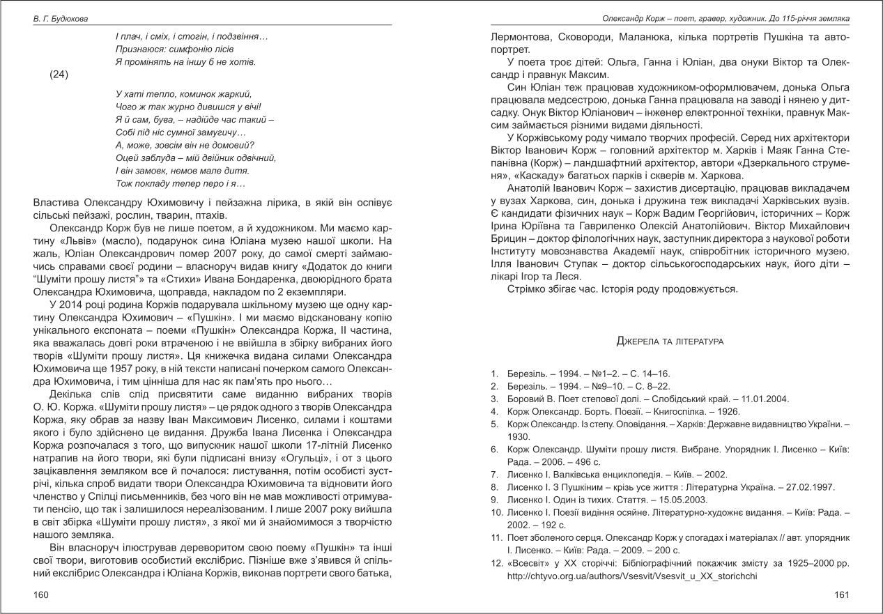 | Бібліографія: | Будюкова В. Г. Олександр Корж - поет, гравер, художник. До 115-річчя земляка. Культурна спадщина Слобожанщини: зб. наук. ст. Число 41, Харків : Курсор, 2019. C. 156–161 , іл. |