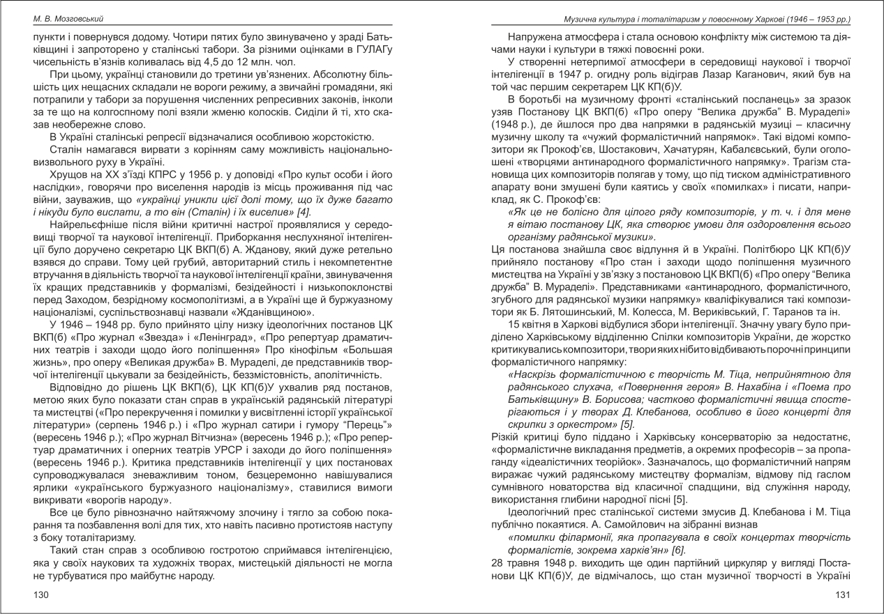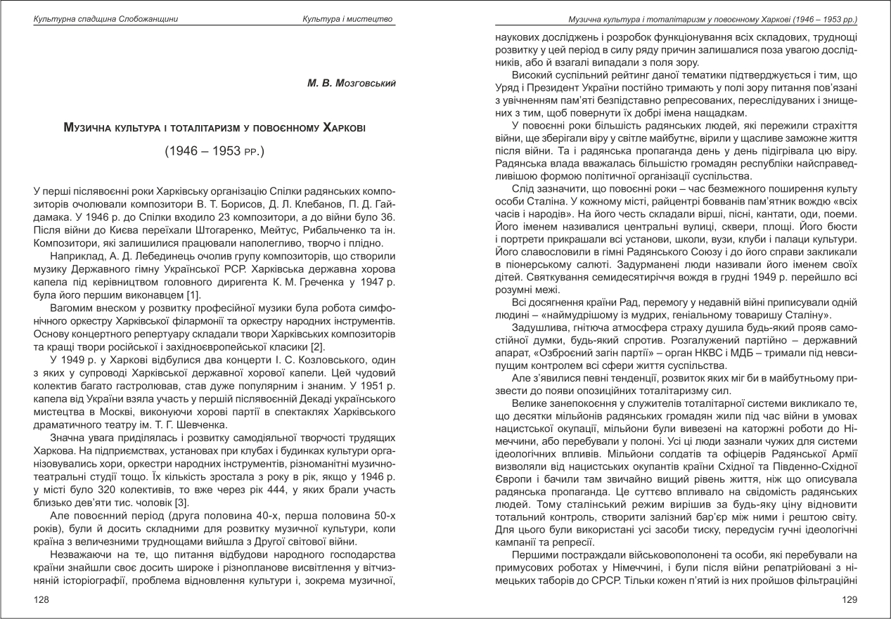 | Бібліографія: | Мозговський М. В. Музична культура і тоталітаризм у повоєнному Харкові (1946 - 1953 рр.). Культурна спадщина Слобожанщини: зб. наук. ст. Число 41, Харків : Курсор, 2019. C. 128–133 |