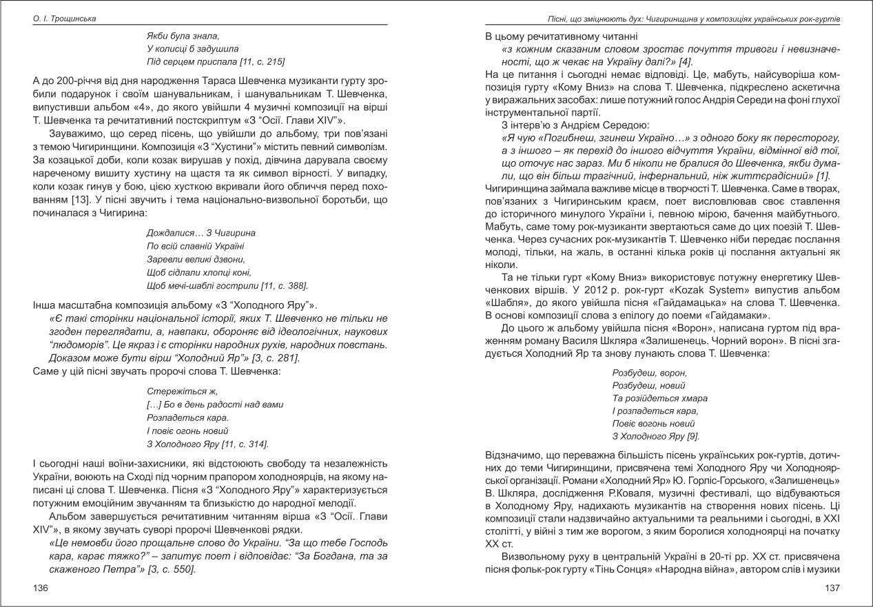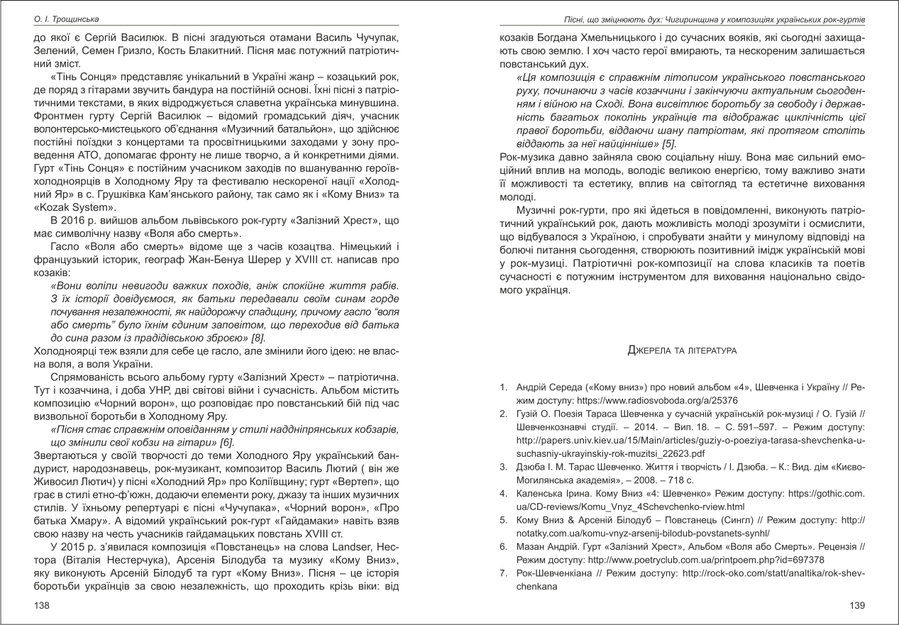 | Бібліографія: | Трощинська О. І. Пісні, що зміцнюють дух: Чигиринщина у композиціях українських рок-гуртів. Культурна спадщина Слобожанщини: зб. наук. ст. Число 41, Харків : Курсор, 2019. C. 134–140 |