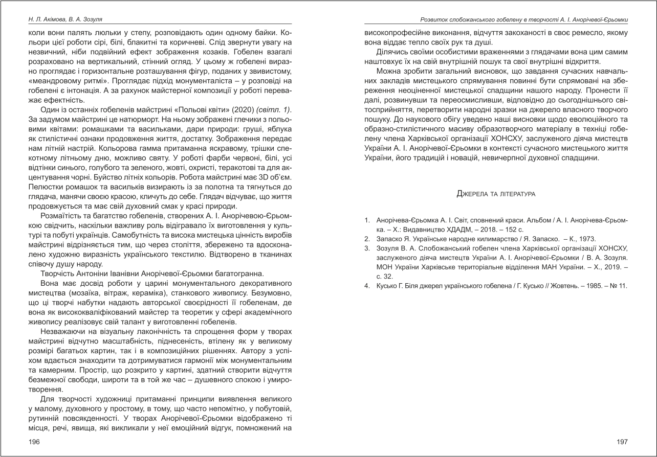 | Бібліографія: | Акімова Н. Л., Зозуля В. А. Розвиток слобожанського гобелену в творчості А. І. Анорічевої-Єрьомки. Культурна спадщина Слобожанщини: зб. наук. ст. Число 44, Харків : Курсор, 2020. C. 190–197 , іл. |