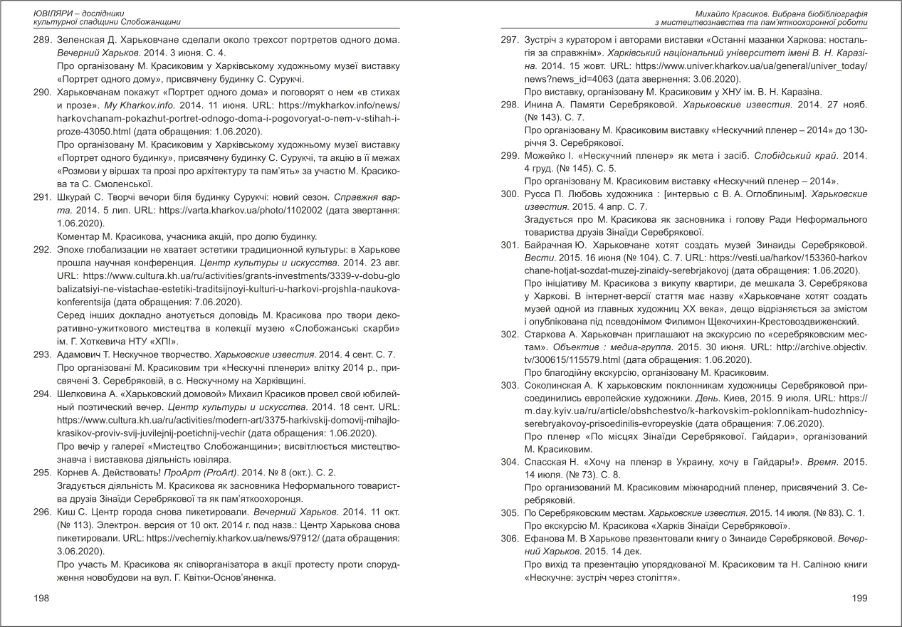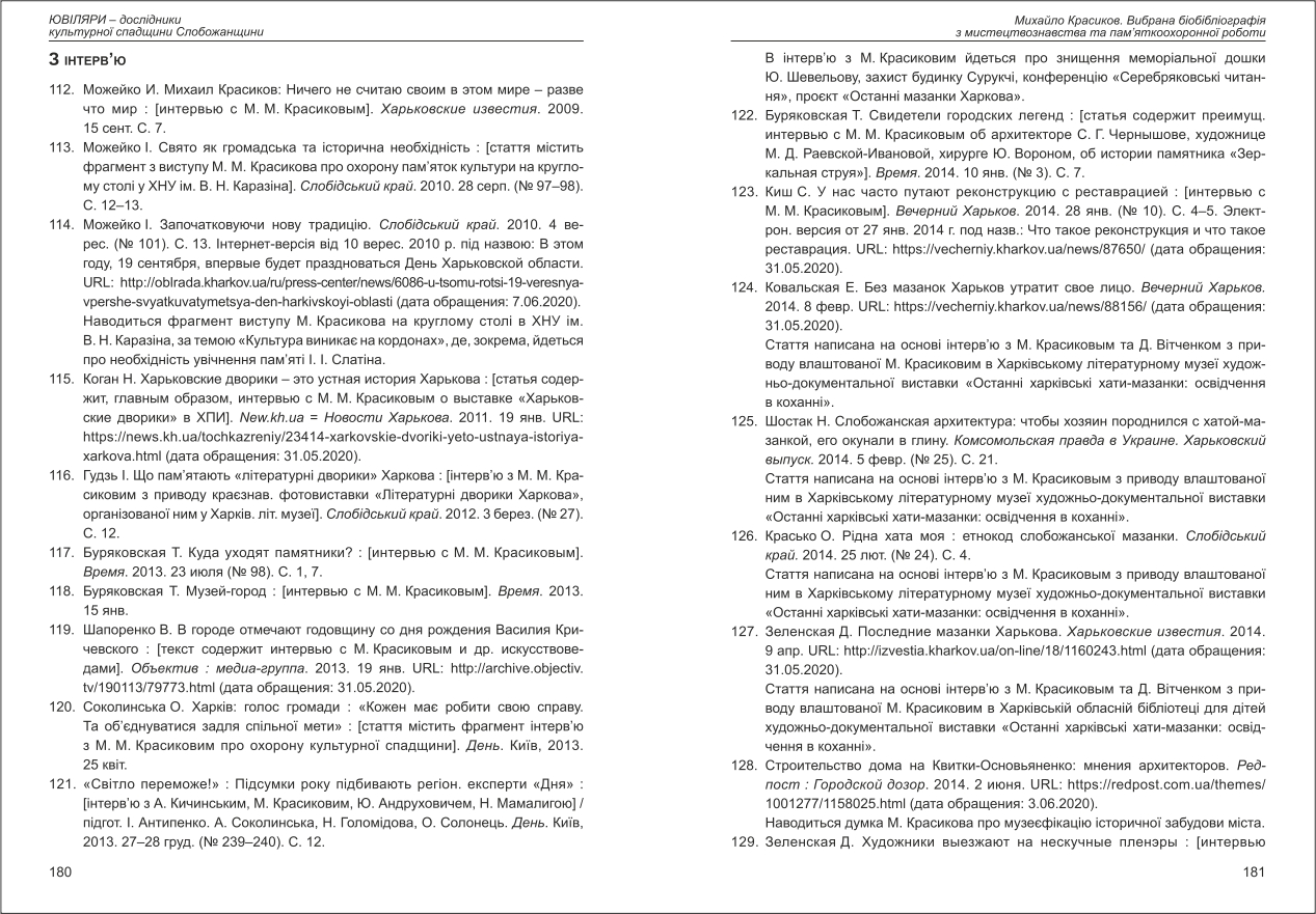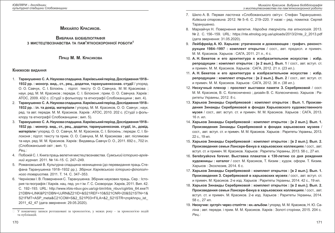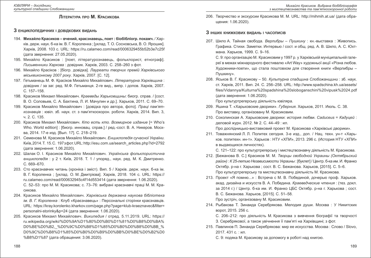 | Бібліографія: | Глибицька С. Б. Михайло Красиков. Вибрана біобібліографія з мистецтвознавства та пам'яткоохоронної роботи. Культурна спадщина Слобожанщини: зб. наук. ст. Число 46, Харків : Курсор, 2020. C. 170–208 |