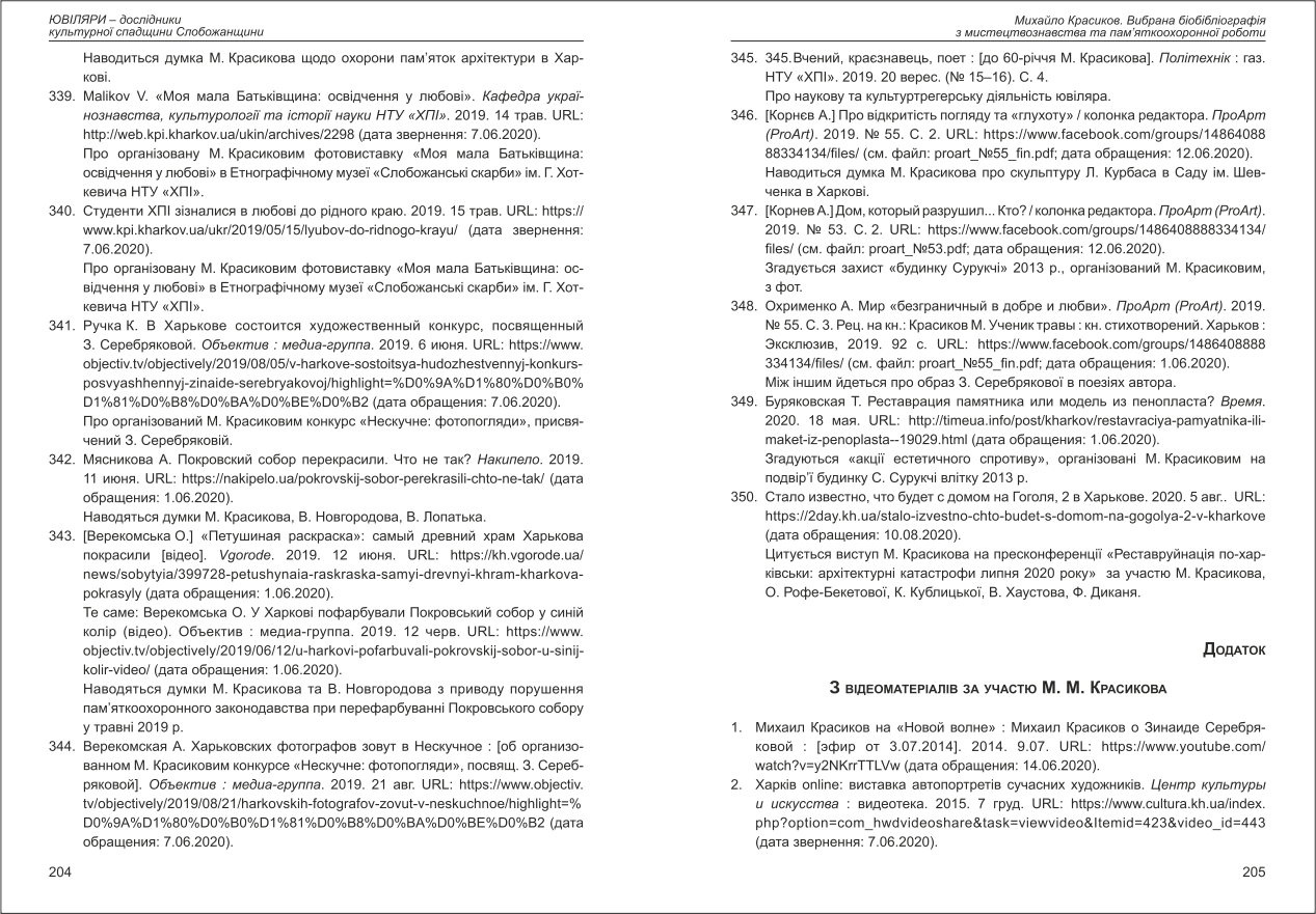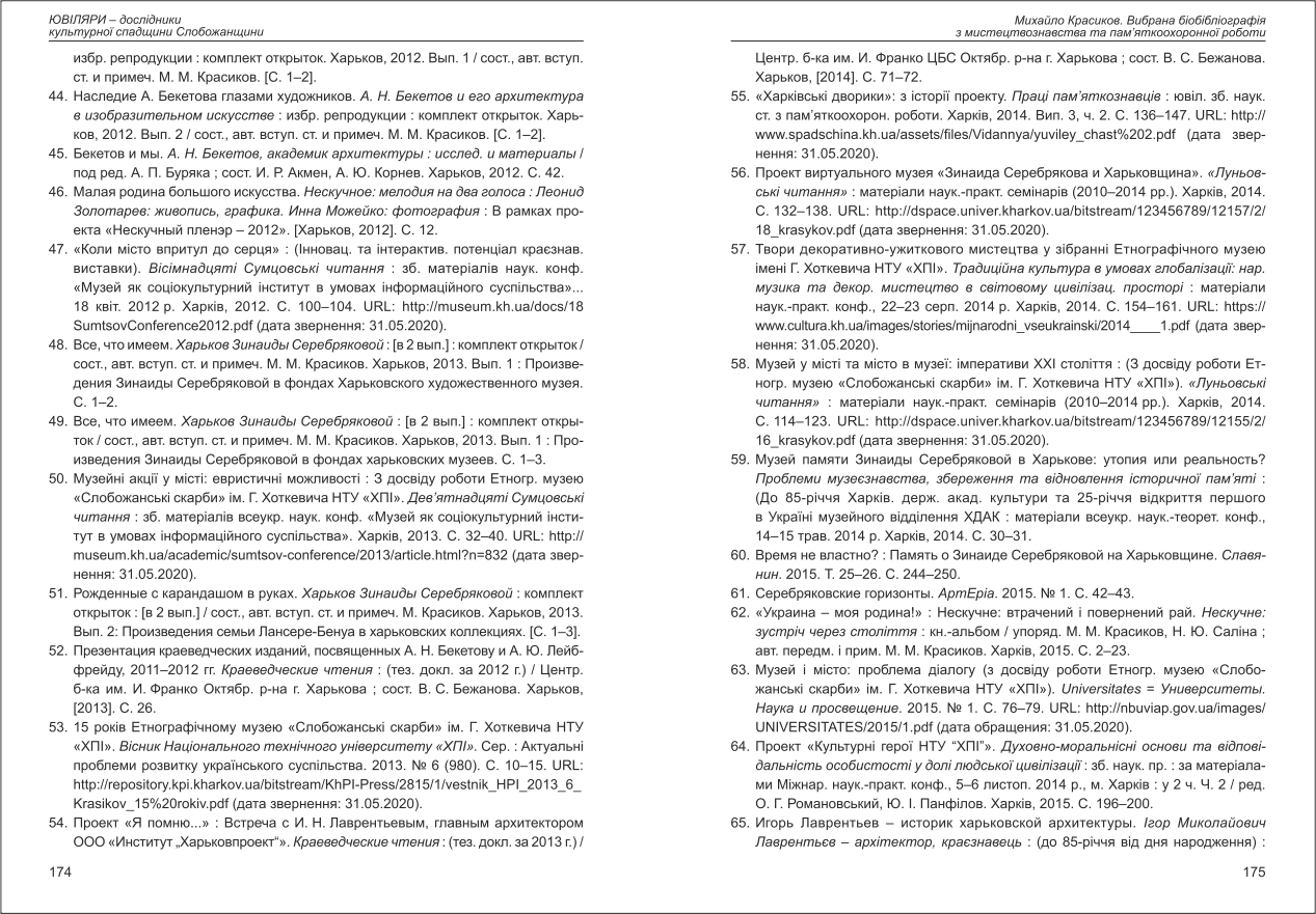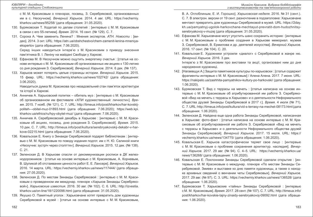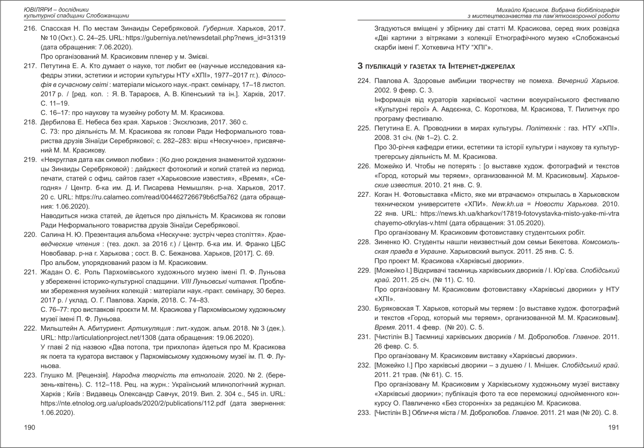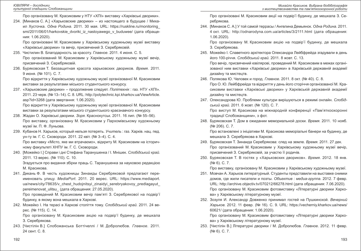 | Бібліографія: | Глибицька С. Б. Михайло Красиков. Вибрана біобібліографія з мистецтвознавства та пам'яткоохоронної роботи. Культурна спадщина Слобожанщини: зб. наук. ст. Число 46, Харків : Курсор, 2020. C. 170–208 |