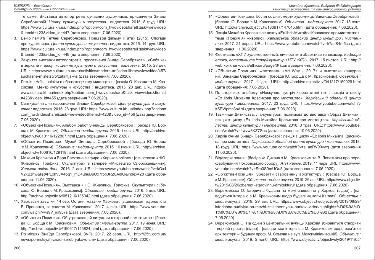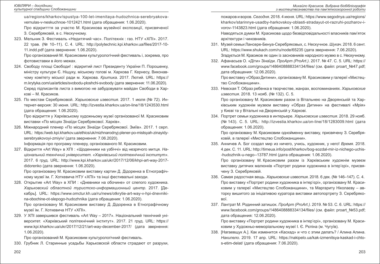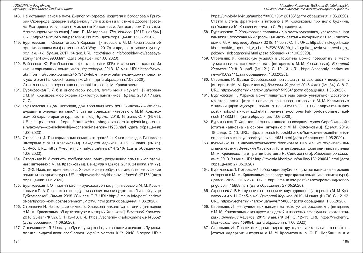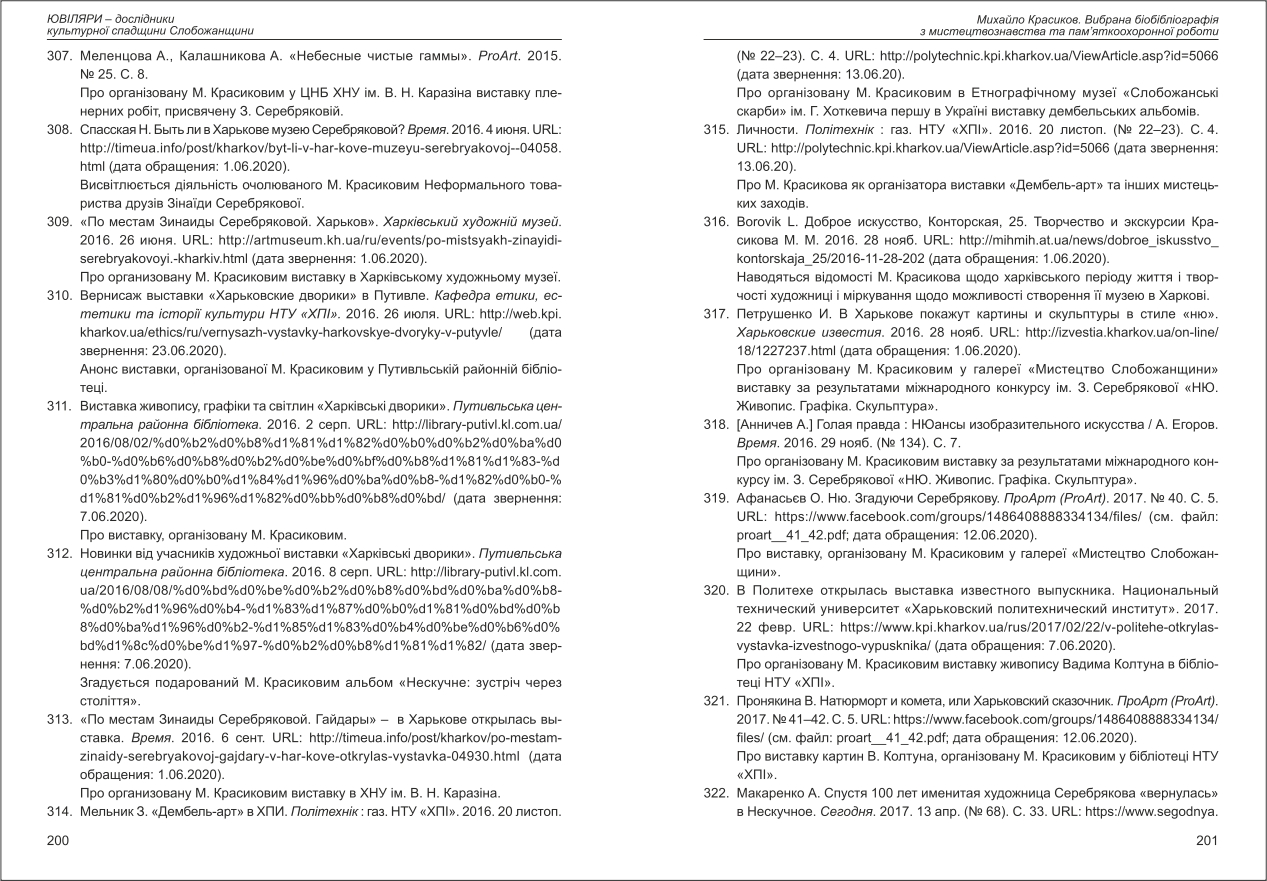 | Бібліографія: | Глибицька С. Б. Михайло Красиков. Вибрана біобібліографія з мистецтвознавства та пам'яткоохоронної роботи. Культурна спадщина Слобожанщини: зб. наук. ст. Число 46, Харків : Курсор, 2020. C. 170–208 |
