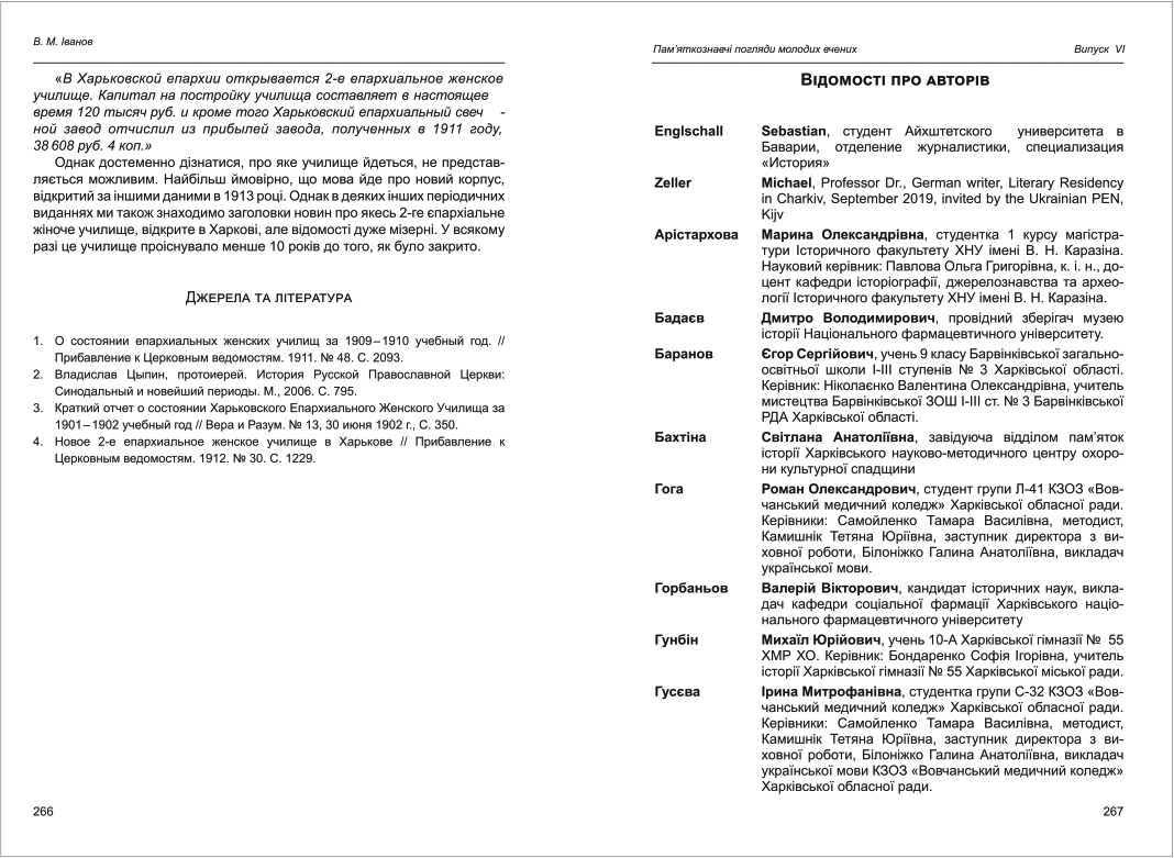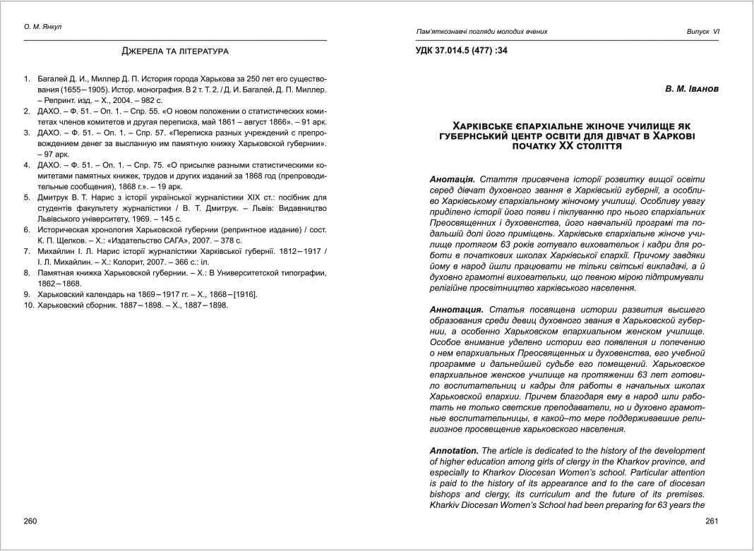 | Бібліографія: | Іванов В. М. Харківське єпархіальне жіноче училище як губернський центр освіти для дівчат в Харкові початку ХХ століття. Пам'яткознавчі погляди молодих вчених XXI ст.: зб. наук. ст. Випуск VI, Харків : Курсор, 2020. C. 261–266 , іл. |