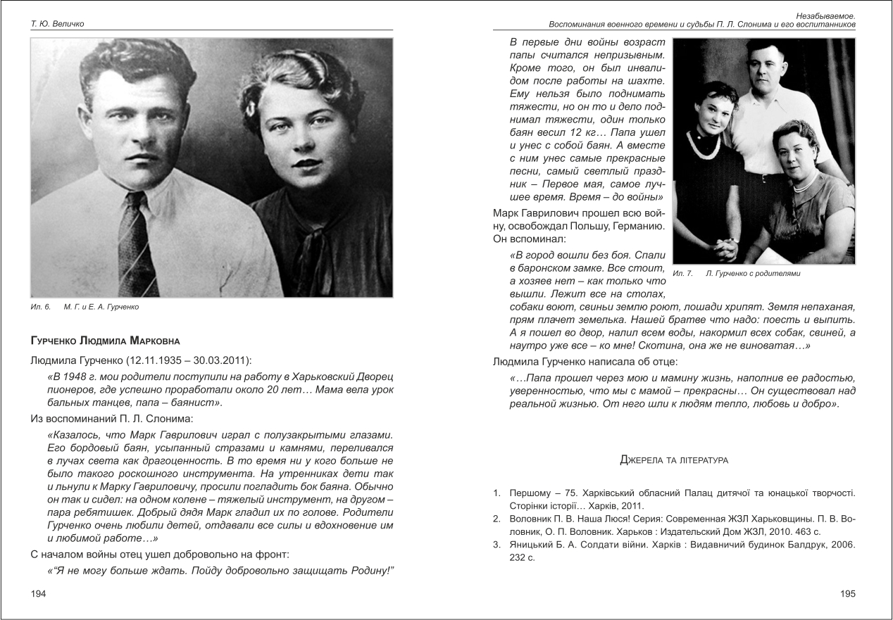 | Бібліографія: | Величко Т. Ю. Незабываемое. Воспоминания военного времени и судьбы П. Л. Слонима и его воспитанников. Культурна спадщина Слобожанщини: зб. наук. ст. Число 49, Харків : Курсор, 2021. C. 182–195 , іл. |