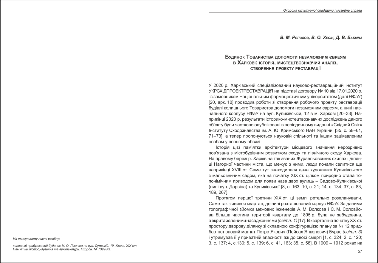 | Назва статті: | Будинок Товариства допомоги незаможнім євреям у Харкові: історія, мистецтвознавчий аналіз, створення проекту реставрації |