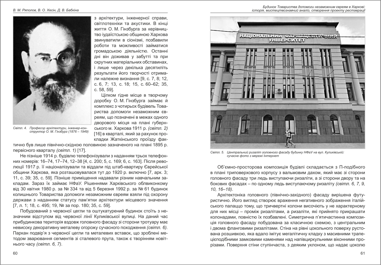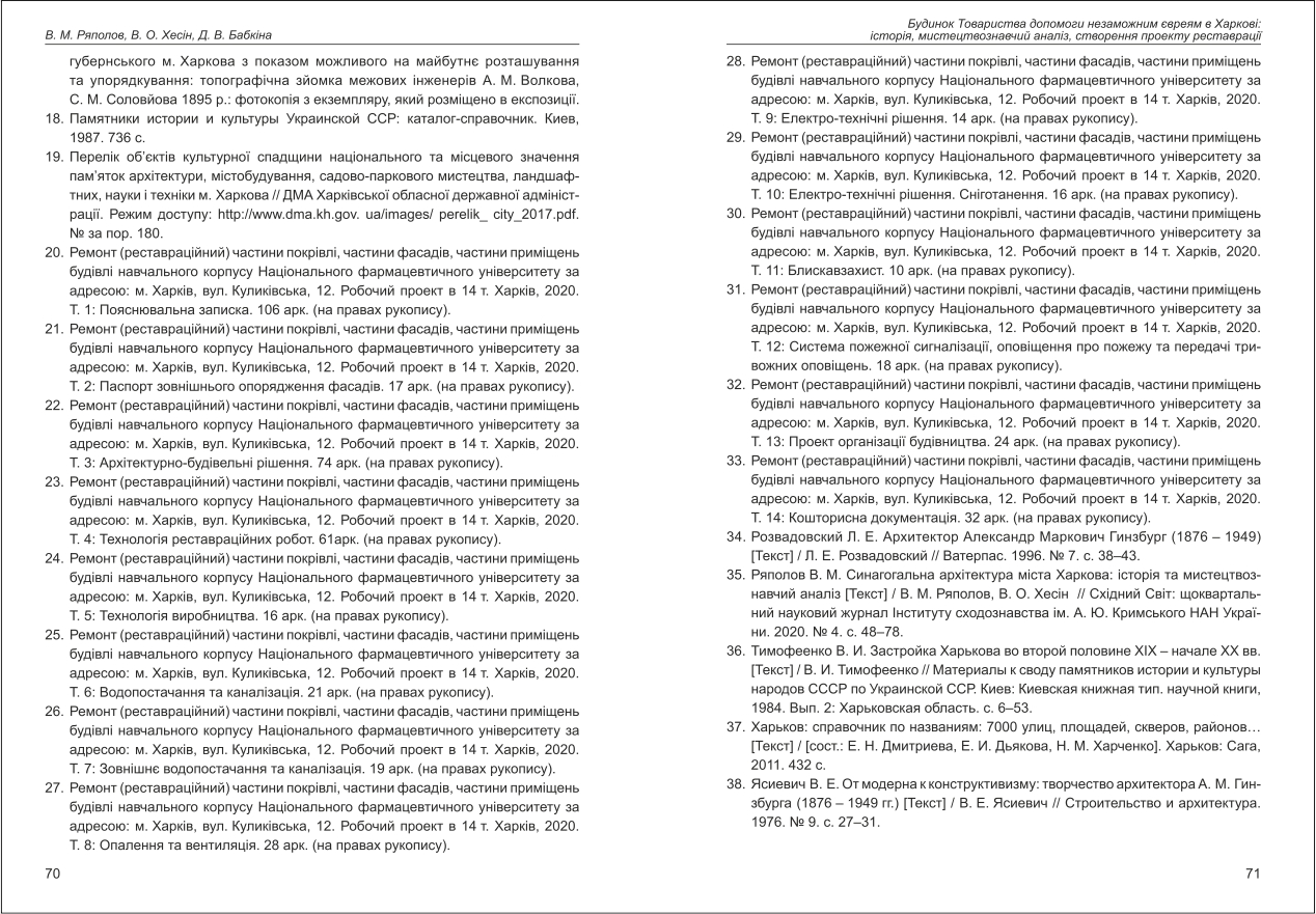 | Бібліографія: | Бабкіна Д. В., Ряполов В. М., Хесін В. О. Будинок Товариства допомоги незаможнім євреям у Харкові: історія, мистецтвознавчий аналіз, створення проекту реставрації. Культурна спадщина Слобожанщини: зб. наук. ст. Число 49, Харків : Курсор, 2021. C. 57–72 , іл. |
