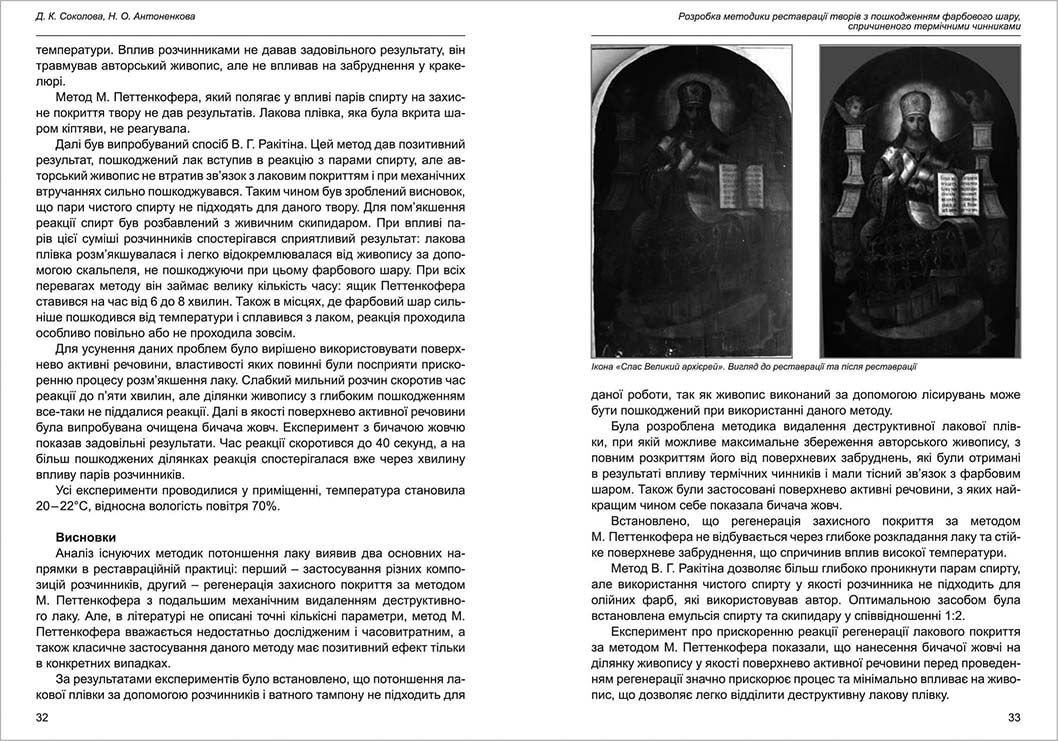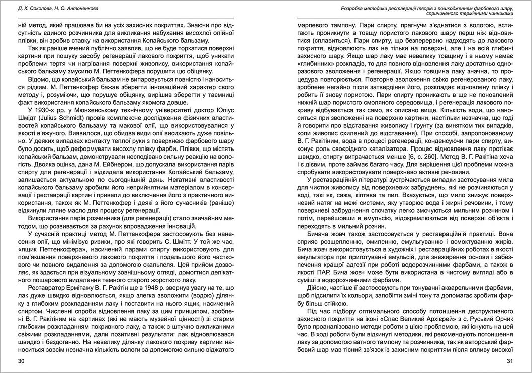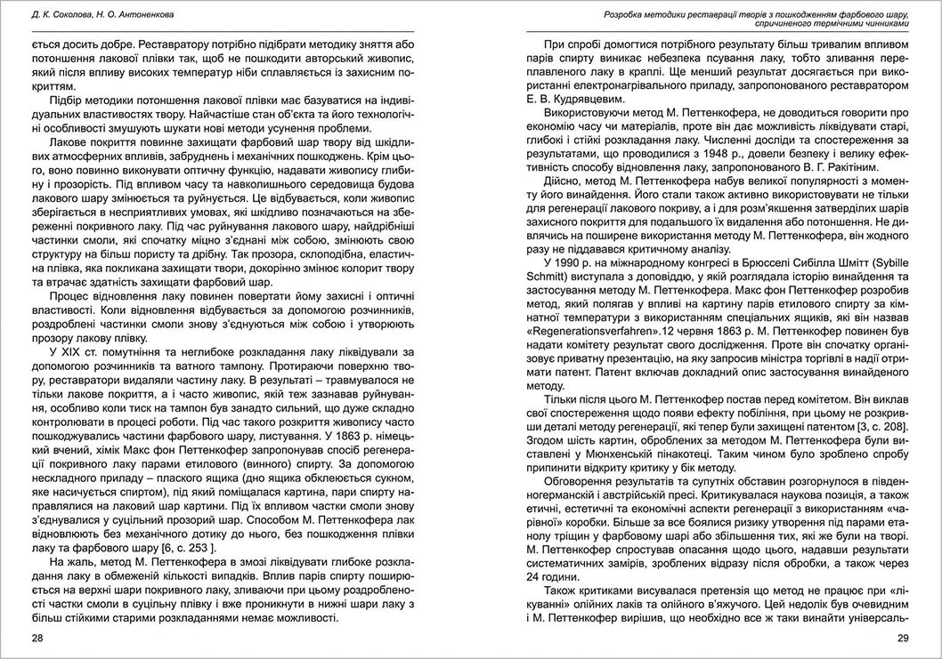 | Бібліографія: | Антоненкова Н. О., Соколова Д. К. Розробка методики реставрації творів з пошкодженням фарбового шару, спричиненого термічними чинниками. Пам'яткознавчі погляди молодих вчених XXI ст.: зб. наук. ст. Випуск VII, Харків : Курсор, 2021. C. 27–34 |