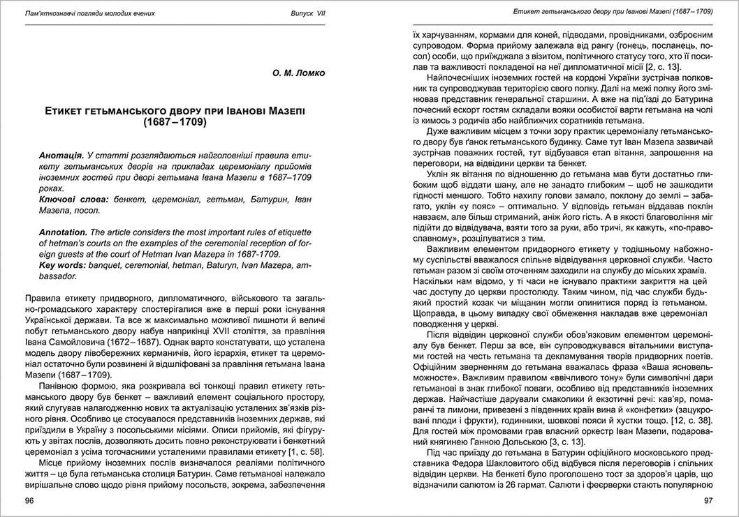 | Назва статті: | Етикет гетьманського двору при Іванові Мазепі (1687 - 1709) |