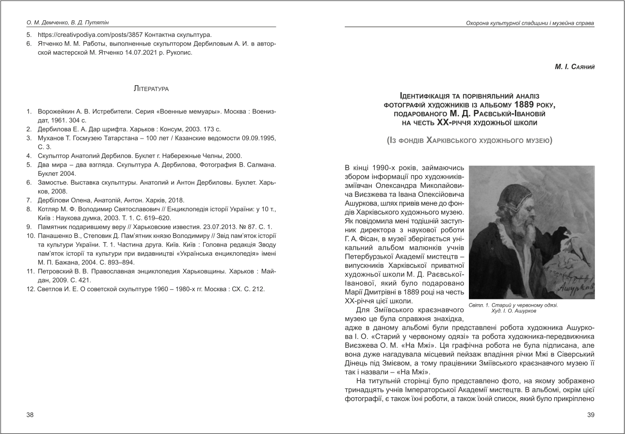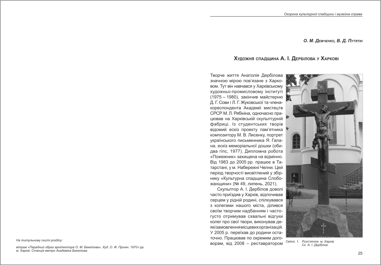 | Бібліографія: | Демченко О. М., Путятін В. Д. Художня спадщина А. І. Дербілова у Харкові. Культурна спадщина Слобожанщини: зб. наук. ст. Число 50, Харків : Курсор, 2021. C. 25–38 , іл. |