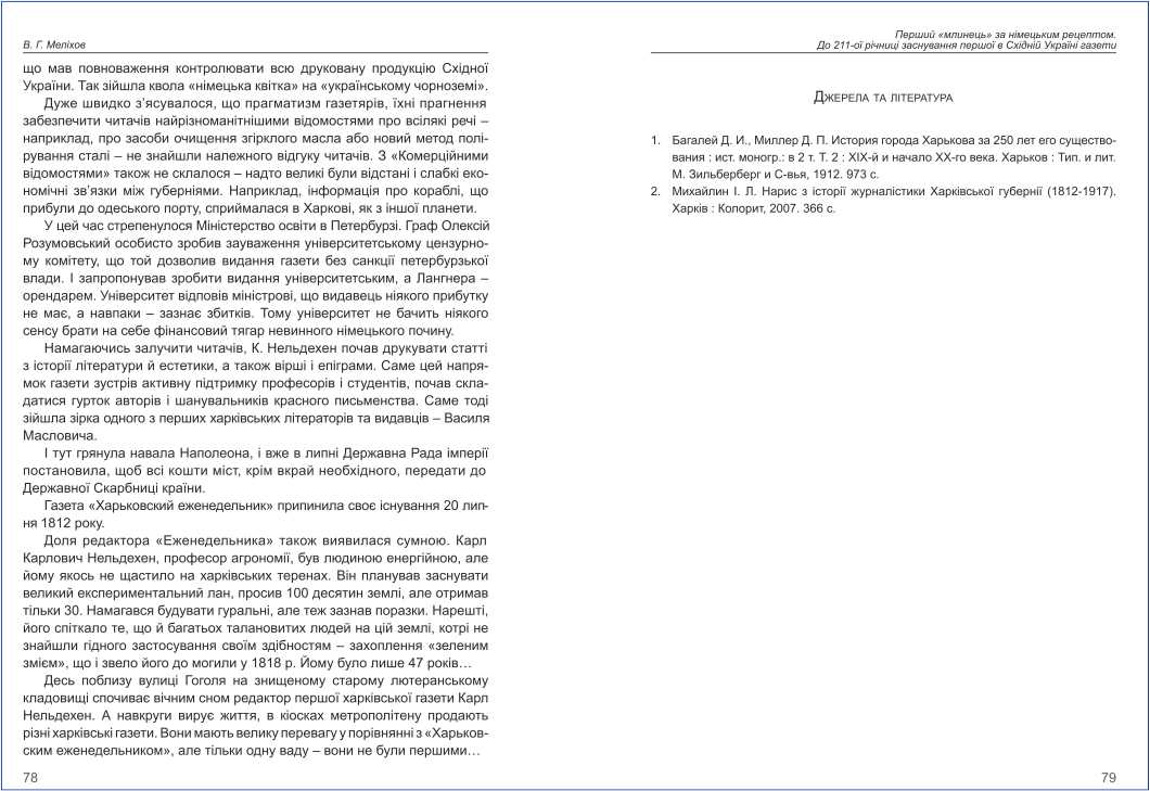 | Бібліографія: | Меліхов В. Г. Перший «млинець» за німецьким рецептом. До 211-ої річниці заснування першої в Східній Україні газети. Культурна спадщина Слобожанщини: зб. наук. ст. Число 53, Харків : Курсор, 2023. C. 75–79 , іл. |
